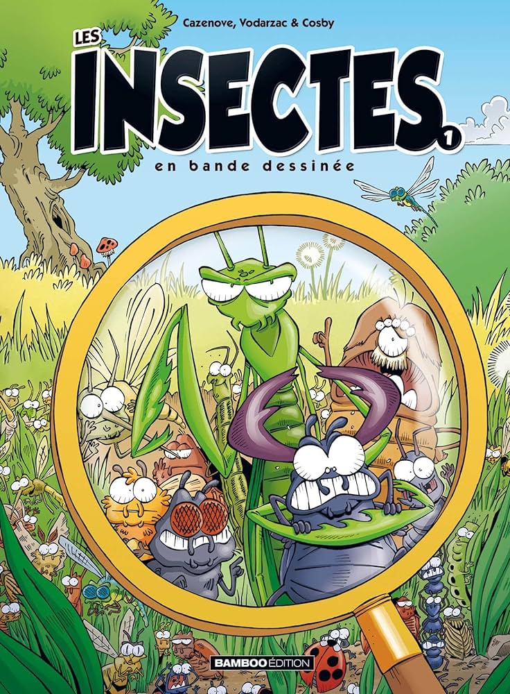 Par exemple, la plupart ne possède pas un sang rouge. Il peut être blanc et même rose. Il n’a pas la fonction d’oxygéner le sang. Pour survivre, ils ont des techniques de pointes pour se protéger des adversaires comme faire le mort ou avoir l’apparence d’un autre. Tout est d’une grande richesse. La nature propose toujours des choses étonnantes qui émerveille sans cesse. Christophe Cazenove, expert dans les bd humoristes grand public et François Vodarzac ont collaboré pour mettre de l’amusement dans la connaissance. On ne s’étonne pas que des attitudes humaines soient transposées chez les bestioles. Cela n’enlève pas la pertinence de la valorisation de certains savoirs. Il montre une forme de transmission avec un enfant avec un livre expliquant à sa grand-mère. Le rôle de transmission à évoluer. L’ouvrage se conclut avec un dossier pédagogique et un quiz. Même si on aurait apprécié voir de vraies photos à côtés des insectes présentées, on se contentera, dans un premier temps, de la première page intérieur avec des photographies. Donc on va poursuivre cette petite série de cinq tomes.