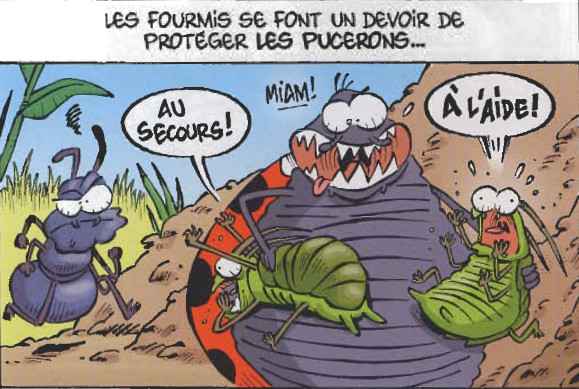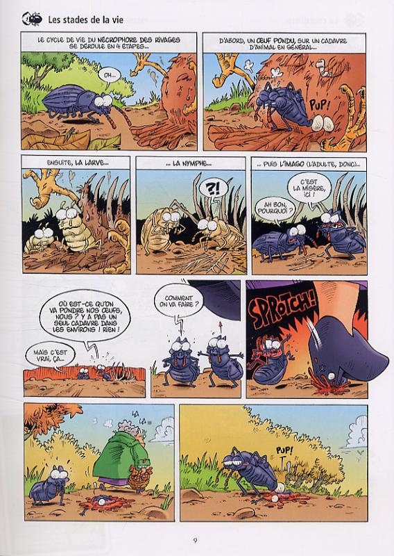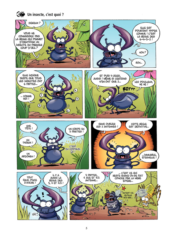 L’appréhension était de mise avant d’ouvrir le tome. Souvent dans les séries Bamboo, l’humour est souvent exagéré et on voit venir les blagues d’assez loin. Mais très vite, me voilà à rigoler simplement à un gag. Comme d’habitude, une page vaut pour un gag et la découverte d’un insecte. Les plus spécifiques ont même le privilège de pouvoir revenir comme le bousier ou le phasme. Il faut dire qu’un animal qui marche à l’envers en poussant une boule de déjection et l’autre qui ressemble à une branche. On découvre une pléthore de bêbêtes plus étranges et amusantes les unes des autres. Cela ne se limite pas juste à rencontrer des animaux mais c’est aussi l’opportunité d’apprendre d’avantage sur eux.
