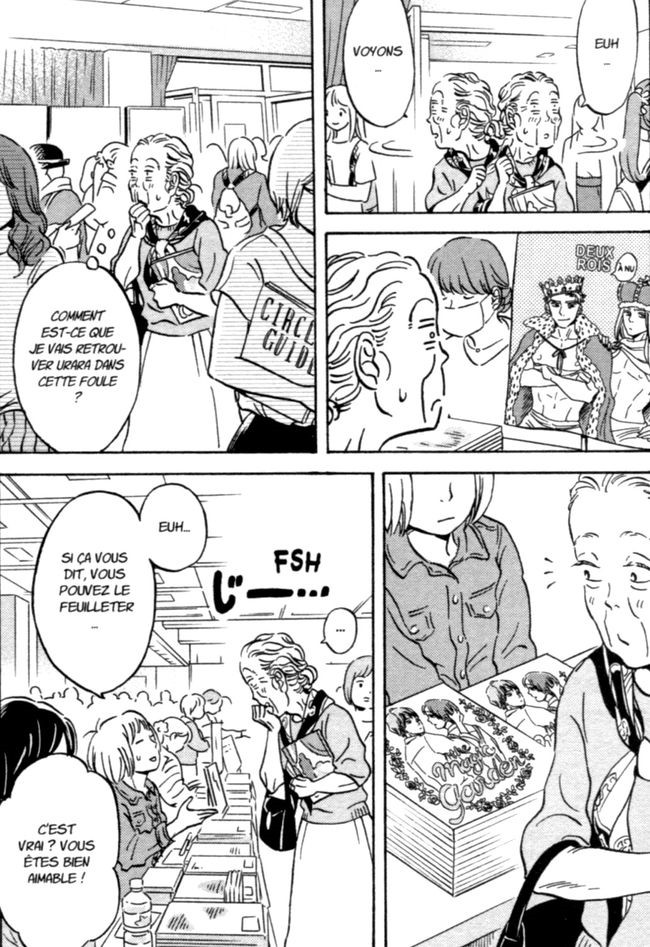 Comment ne pas tomber sous le charme de ce duo d’amies assez surprenant? Une mamie et une adolescente adorent les boy’s love. Le salon qui réuni les mangakas amateurs n’est qu’une étape dans leurs partages. Elles se donnent des rendez-vous plus fréquents pour parler de leurs découvertes et déguster une gourmandise au passage. Rien de tel que la lecture pour créer du lien fort et intergénérationnel. Ces deux là étaient là pour s’entendre. Il suffit de peu parfois pour rapprocher les gens et casser la peur de l’inconnu. Des moments touchants, sincères où les mots s’échangent en toute franchise. Surtout que l’impatience les lie car à chaque lecture de tome car il faut attendre 18 mois entre chaque tome. Et avec la pré-publication en magazine, ce n’est pas forcément mieux puisqu’il a que quelques éléments par semaine. L’action n’est pas au rendez-vous dans ce manga puisque les choses font des aller/retour dans le passé ou tourne autour du pot avec l’indécision des personnages à se mettre en couple. Par conséquent, elles butinent à droite à gauche dans d’autres tomes. Kaori Tsurutani aborde aussi d’autres aspects relationnels. Un garçon tente de se rapprocher d’Urara et elle ne s’intéresse pas vraiment à lui. Cette proximité avec elle, la perturbe. Pourquoi? En même temps, il a une copine. Cette dernière est jalouse d’elle. Pourquoi ressent-elle ce sentiment? Il n’y a aucune raison. Et enfin, Yuki n’est plus de prime jeunesse. Jusqu’à quand pourra t’elle rester seule et donner des cours de calligraphie? Vieillir n’est jamais simple. Comment conserver au maximum son autonomie. Comment évaluer l’avenir? La lecture redonne t’elle une saveur particulière à la vie? Le lecteur ne peut qu’être émerveillé par cette création qui donne envie de poursuivre l’aventure à leur côté. Qui n’aime pas partager sa passion avec des individus qui vous comprennent?