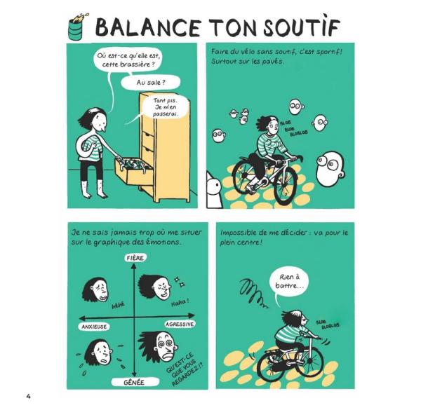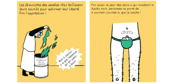 Les récit en trois pages sont toujours d’une grande finesse et avec une touche d’humour très délicate. Elle commence en parlant des tétons des femmes qui indisposent tellement. C’est trop choquant alors que ceux des hommes ont passe partout. Les femmes n’ont pas envie ou besoin de porter des soutiens gorge et qui cache les tétons. « Les féministes des années 1960 brûlaient leurs soutifs pour affirmer leur liberté. Fini l’oppression! Fini aussi la peur des seins « qui tombent ». Après tout, personne ne personne de « soutien-couilles, que je sache! » (p. 5). Des mouvements autour du free boops et quels que soient son tour de poitrine. Elle aborde aussi de façon décontracté les poils aux pattes. Pourquoi juste les hommes auraient le droit de les avoir velu? Et en quoi est-ce que c’est viril? « Les jambes lissent sont devenues à la mode dans les années 1940, quand les jupes ont commencé à raccourcir… et que les bas en nylon était un luxe. Dès les années 1960, c’est devenu un idéal. » (p. 9). Et c’est aussi l’occasion de parler de la fameuse taxe rose. Les femmes gagnent moins que les hommes et pourtant les produits les concernant sont plus chers. Par exemple sur les rasoirs souvent roses pour les dames et bleu pour les messieurs. D’ailleurs pour la couleur marquée sur les genres, il faut savoir que cela n’a pas toujours été ainsi. « Incroyable mais vrai : historiquement, le rose était plutôt masculin, et le bleu féminin. Ce n’est qu’avec l’utilisation du bleu dans l’armée au XIXe siècle que la tendance est inversée. » (p. 25). Donc il n’y a pas de vérité absolue, c’est toujours lié à des construction sociale.