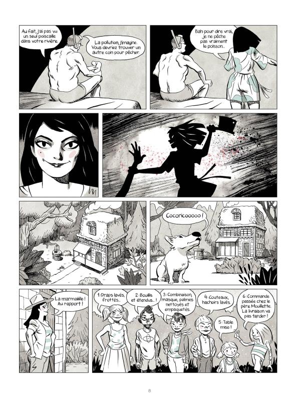 Quand on regarde une couverture, il ne faut pas y projeter un récit. Car après, quand on se plonge dans l’histoire, bien souvent, cela n’a rien à voir. C’est bien ici le cas ce qui m’est arrivée. Je n’avais pas fait attention que l’éditeur était Fluide Glaciale. En faisant attention à ce détail, je n’aurais pas emprunté cet ouvrage. Car par conséquent, il n’y aurait rien d’onirique, de merveilleux ou de délicat. On va avoir un bon gros truc complétement absurde et loufoque. Par conséquent, la déception est très vite arrivée. Une charmante jeune femme attrape des hommes en péchant près de chez elle. Puis, elle les invite à dormir une nuit, couche avec eux et les tue le lendemain matin pour nourrir sa marmaille. Chaque gamin a des tâches précises comme nettoyer l’espace sali par le sang ou la cuisson. Ils ont tous un air de psychopathe. L’ambiance bizarre a débuté.