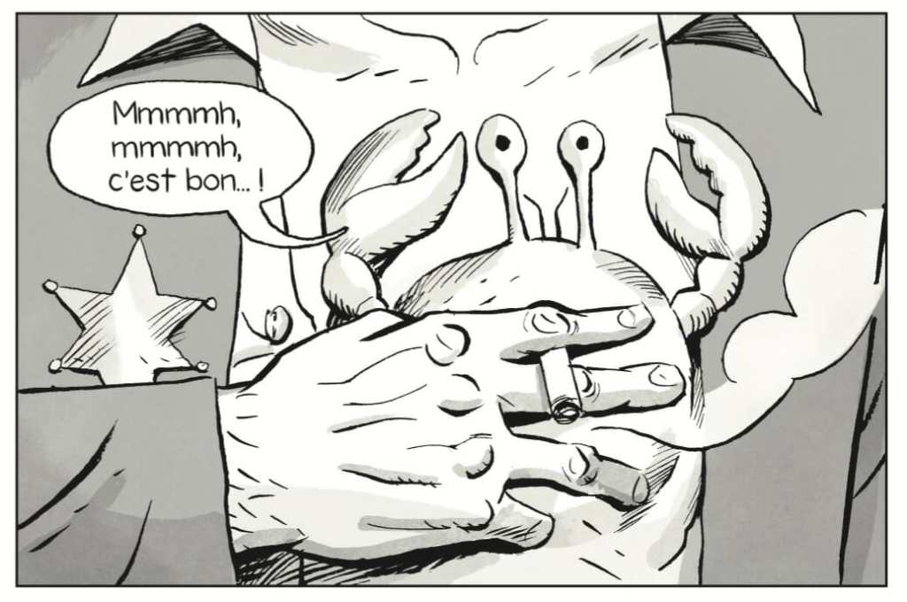 L’avantage, c’est qu’ainsi le ton de la bd était donné. Il n’y avait pas de mauvaises surprises par la suite. Cela ne pouvait aller qu’en empirant. On enterre le corps d’un enfant pour qu’il puisse renaître. Un instrument de musique redonne vie aux morts grâce à la magie. Un garçon qui a grandit dans le futur revient dans le présent avec un enfant avec des tentacules sur la tête. Un cancer symbolise par un crabe parlant greffé sur le torse qui finira cuit au feu de bois. Et cela va même jusqu’à une relation incestueuse entre une mère et son fils comme épilogue. Il fallait s’accrocher pour terminer. Heureusement que les dessins étaient net et précis. Et qu’il y avait un petit jeu avec entre le gris prégnant et des pointes de couleurs sur les joues ou des objets, comme un qui ressemble à une autre de Calder. Il est important de lire des créations décevantes car cela rappelle la vigilance qu’il faut avoir dans le choix de ces lectures.