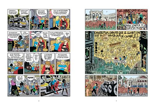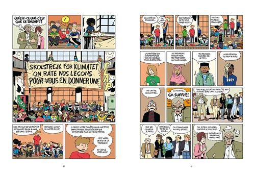Quand les enfants retournent à l’école, le trio à lancer un mouvement de fond. Les collégiens ont décidé alors de manifester pacifiquement. Ils ont établis une liste de revendications dans le but de contribuer à des actions écologiques comme remplacer les robinets qui fuient, les fenêtres qui ne ferment pas, mieux gérer le chauffage qui tourne H24… Rien n’y fait, le directeur de l’école ne tient compte de rien de cela. Il appelle la police. Tout tourne à la catastrophe et nos héros sont virés. Ils craignent de rentrer chez eux. Que vont dire leurs parents? Légalement, est-ce que l’on peut dégager des gamins comme ça? J’en doute. Mais c’est un retournement de situation pour donner plus d’importance à la suite. Les médias sont présents micros tendus pour prendre des témoignages. Rien de tel pour nous inciter à lire le tome 2.