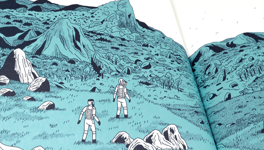 Dès la première page, on voit que l’on est dans un monde particulier. Le trait est net, précis et joue avec un contraste de bichromie. L’aspect est très futuriste rappelle « Brève histoire du Robo-Sapiens » de Shimada Toranosuke ou « L’humain » de Diego Agrimbau et Lucas Varela. On se laisse happer par cette fausse simplicité. L’idée de Jeremy Perrodeau est très novatrice.