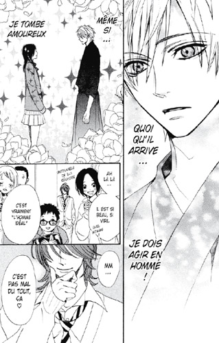 On en vient à suivre Asuka très bon en arts martiaux, qui aime les filles et qui doit cacher des choses moins « viriles » de sa personnalité. Le concept est assez étrange et dérangeant à la fois. Pourquoi autant insister avec le mot virilité qui est bien souvent associé à égoïste, narcissique, violent… Et rajouter à cela un début d’une histoire d’amour naissante. Le père de l’adolescente est lui aussi dans le cliché discriminant. Un homme doit savoir se battre et défendre l’honneur d’une femme et une nana, être potiche, femme de ménage, cuisinière et nurse. La blague est que le gamin arrive à le faire changer d’avis. Est-ce vraiment drôle? Après on enchaîne avec le pote qui drague toutes les nanas qu’ils rencontrent. Asuka ne trouve pas ça honorable. Pff. Cela a été imprimé en 2009 pas en 1959. Espérons que la suite relèvera le niveau car j’ai toute la série à lire et que l’on va dépasser le stéréotype bleu et rose.