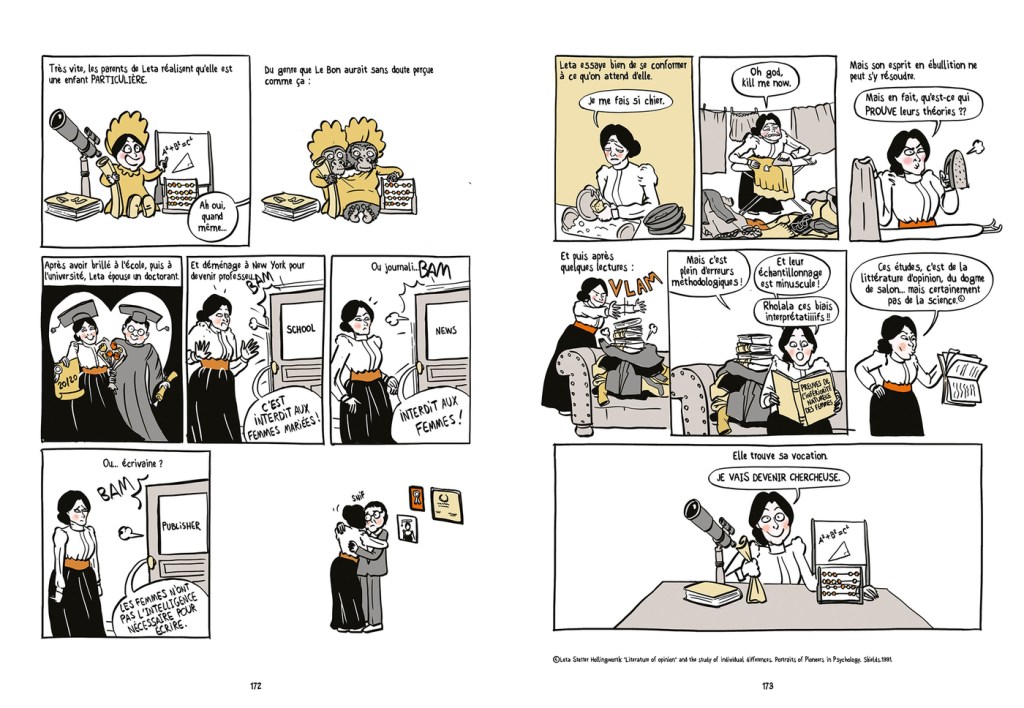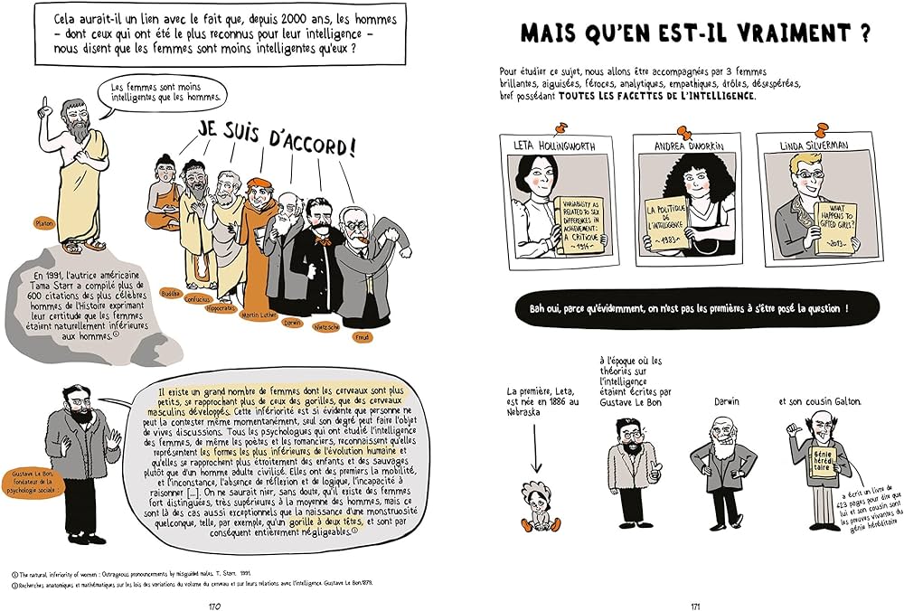 Certes on évoque l’Antiquité, pourrait-il en être autrement? Mais toutes les époques sont abordées. Les arguments dit scientifique pour prouver l’infériorité sont tous facile à contrer tellement c’est ineptes et tordues. Bien entendu, les communautés de couilles les valorisent car elles vont dans leur sens. Par chance de tout temps, des femmes ont su faire la différence et montrer leur intelligence. Quoi l’intelligence ne se trouve pas dans les testicules? Incroyable. On apprend, découvre, s’émerveille, s’amuse… Quelques pages suffisent pour faire du sens. Rien de tel pour enrichir notre esprit critique et plus interroger les pseudos faits. D’autant plus, que l’on cela continue de nos jours avec des inepties qui se poursuives encore et encore. Par conséquent, il faut avoir cette bande dessinée dans sa bibliothèque personnelle. La relire par moment et la conseiller à tout son entourage. Dans la lignée de Titiou Lecoq, Mona Chollet, Benoîte Groult, on peut dorénavant rajouter la sociologue et psychologue Erell Hannah. Et garder un oeil sur son blog ilsabusentgrave.com dont son issue les récits.