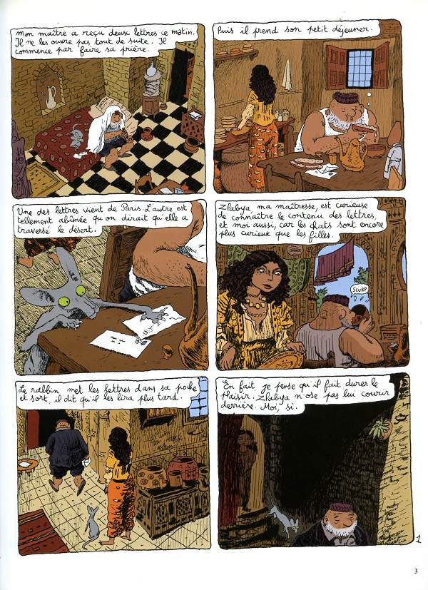 Alger, une communauté juive du début du XXe siècle. Au centre de l’action, le chat du rabbin. Tordant, le chat : un squelette à oreilles, une dégaine de poubelle, un goût prononcé pour la discussion ? c’est un chat parlant. En l’occurrence, il raconte à Zlabya, sa maîtresse adorée (et fille du rabbin), la vérité sur le Malka des Lions ? un cousin qui doit arriver prochainement, tout auréolé et légende. On le dit capable de dompter un lion, même les yeux fermés. La vérité, c’est qu’il a pour ami un vieux lion poussif avec lequel il a monté un numéro : le lion effraie le monde, le Malka arrive et arrange tout. Ce qui lui attire gloire et récompenses variées. En attendant, le rabbin a un problème : le consistoire israélite de France exige de lui qu’il fasse une dictée. En effet, s’il veut être agréé rabbin officiel au lieu de « juste rabbin comme ça », il doit écrire en français ? pour faire la prière en hébreu à des Juifs qui parlent arabe, note le chat dans sa grande sagesse. Le chat est désolé : « Mon maître, qui aime tant les livres, est en train de louper sa dictée. » Ce qui le pousse, en désespoir de cause, à invoquer le nom de Dieu alors que c’est interdit. Résultat : il perd la parole, retrouve son statut de chat qui fait miaou, et le voilà incapable de donner son avis quand sa maîtresse adorée projette d’épouser un type qui ne lui plaît pas. Heureusement, pour notre plus grand plaisir, il continue de penser : « Il va te prendre ta fille et tu seras vieux et elle sera enceinte et elle sera vieille et elle aura des enfants qui seront vieux et tout le monde mourra. » C’est très triste, mais on note une bonne nouvelle : contre toute attente, le rabbin a réussi sa dictée ? « le consistoire français il est très fier de vous » ! Sfar nous donne encore une fois un chef-d’oeuvre d’intelligence, d’humour et de tendresse ? trois vertus qui s’expriment autant dans les dialogues, captivants et savoureux, que dans le dessin, merveilleux de finesse et de drôlerie. La préface de cet album est signée Fellag.
