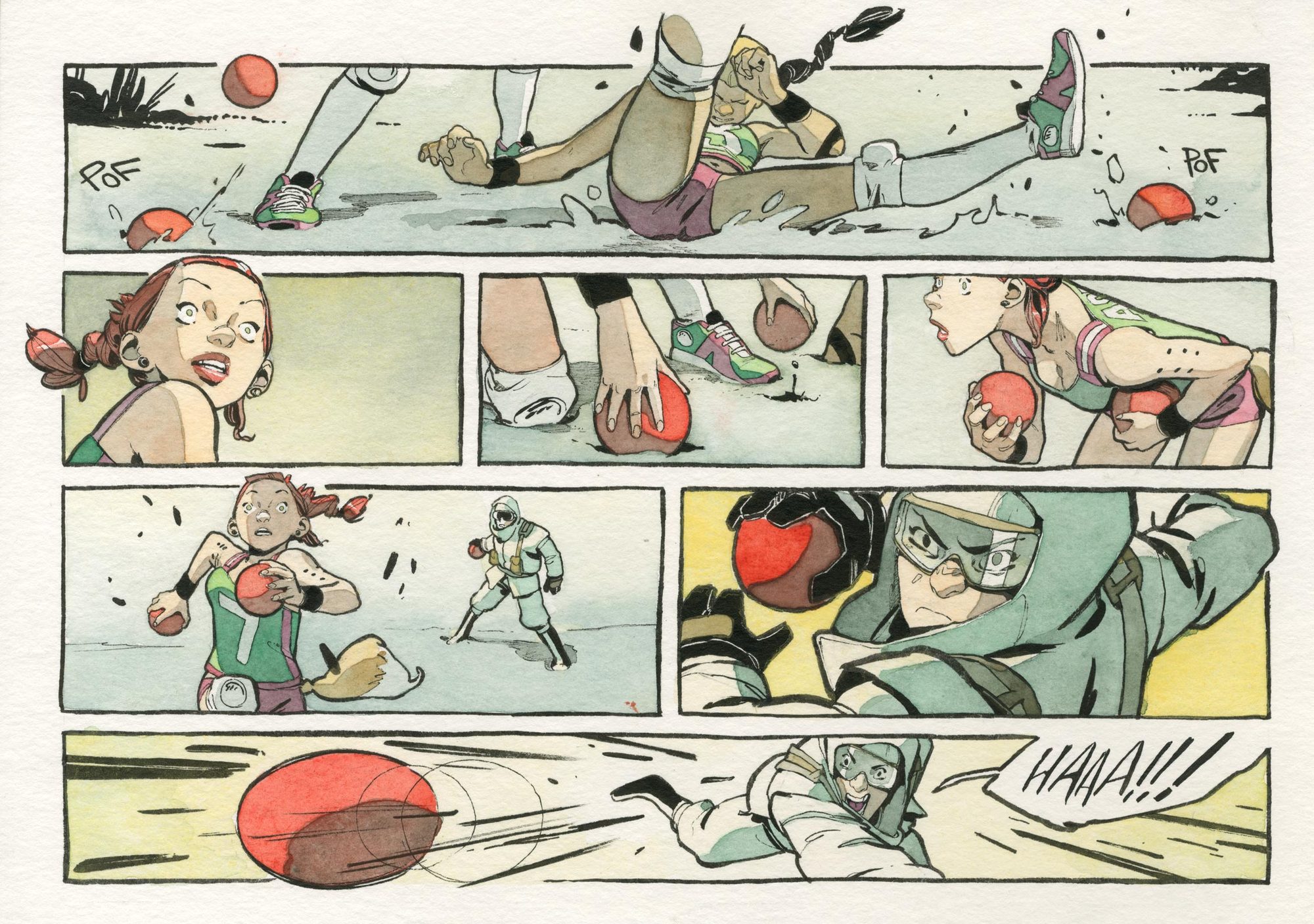 Jouer l’avenir du monde à la balle au prisonnier est audacieux et totalement fou. Comment ne pas être admirative d’une telle assurance et capacité d’imagination? Dorénavant, on patientera un peu pour lire la suite. Une certitude, elle sera à la hauteur de nos espoirs. La mise en page est dynamique, fluide et cohérente. L’action est prenante et captivante. Rien n’est laissé au hasard pour le plus grand plaisir