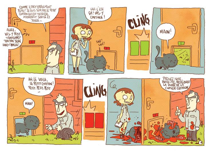 Le souci est l’exagération dont le but est vraiment de faire du dégueulasse avec des mecs dégueulasses. C’est plus exaspérant qu’amusant. Pourtant le genre peut-être drôle comme « Le coup du lapin » d’Andy Riley où l’on voit un lapin qui tente inlassablement de se suicider. Et même les moments où l’on nous explique comment est vraiment vidé un cadavre ou comment on coud une bouche dans « Davy Mourier versus la mort » est moins glauque. Je maintiens que l’on peut faire rire sans sortir les gros sabots des clichés, du vulgaire et du sanglant.