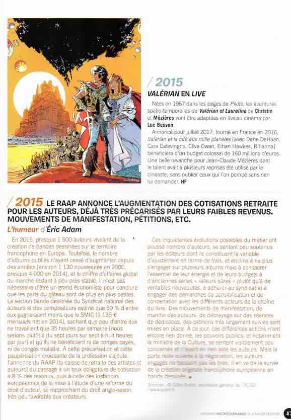dBD propose un panel historique de la bande dessinée. Il décide d’évoquer aussi bien les oeuvres phares, les festivals, les séries, la presse spécialisée, la grogne des artistes femmes ignorées… Ainsi qu’importe son âge et à partir de quand on a commencé à lire du 9e art, on trouvera son compte. A part si vous êtes des adeptes de « Naruto » ou « One piece » car les publications modernes des mangas sont laissés un peu de côté. On ne doute pas un instant qu’il a du être difficile de faire un choix car tellement de choses sont mémorables. Surtout que l’on ne se résume pas uniquement à la bd franco-belge. Pour donner une dynamique à l’ouvrage, il y a parfois juste une date avec une phrase courte et d’autre fois, c’est beaucoup plus long. Les tournures ne sont pas souvent neutre. Les témoignages reflètent la passion de chaque auteur. La neutralité n’est pas rigueur ici. Au final, on a passé un bon moment avec une liste de choses à découvrir.