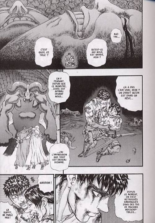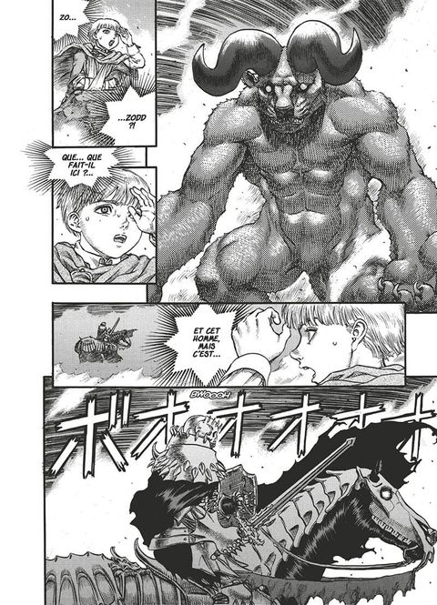 Le tome précédent nous avait bien préparé à l’horreur qui allait nous être présenté. Donc ici pas de cauchemars en perspective suite aux visages des monstres plus terrifiant les uns des autres. En plus, tous n’ont qu’un seul objectif : bouffer les humains et donner de la gloire à Griffith. Le petit gars a choisi un chemin de vie bien singulier. Le petit gars prétentieux grâce à la béhérit devient un dieu diabolique et rejoint les God Hand. Pour affirmer sa transition, il viole Casca, nue devant lui. Kentaro Miura prendra son temps pour bien décrire ce moment assez gênant. Il souligne surtout que bien qu’elle soit violer, elle prend beaucoup de plaisir. Insister là-dessus en rajoutant des images hyper-sexualisé déstabilise. Surtout qu’elle est totalement nue, les mains attachées, avec une posture mettant en valeur sa poitrine, l’expression heureux de son visage et la musculature. L’autre est totalement habillé et on ne voit pas son corps. L’agresseur préserve son intimité. Même si cela est propre au genre cela reste dérangeant. D’autant plus que plus d’un mec va se masturber sur cette scène rajoute un aspect bien dégueulasse. Espérons qu’il n’en soit pas de même lorsqu’on voit les derniers souffles de Pippin et Judeau. Des personnages auxquelles nous avons eu le temps de nous attacher précédemment et qui finissent vraiment très mal.