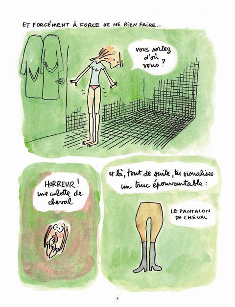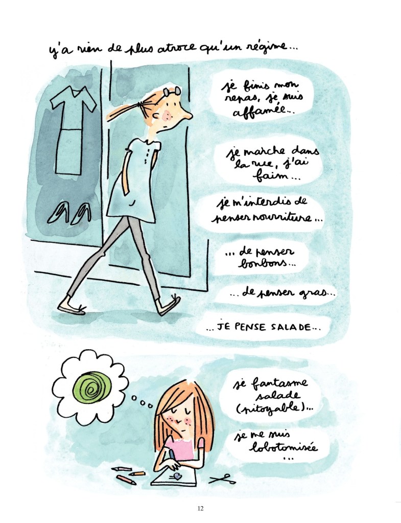 La créatrice a bien souvent été cataloguée dans la catégorie girly et être publié dans « Elle », à tendance à confirmer cela. En effet, elle parle de son quotidien à la maison avec ces enfants. Surtout que cela débute avec une problématique sur son très léger surpoids. Le bourrelet de l’horreur qui n’a pas sa place sur son corps. Elle évoque ces ados et les montre clairement. En plus, au niveau graphique, elle met un coup de pied dans le classicisme gaufrier, cadre noir et dessins léchés. Elle peut faire une page entière sur le remplissage du frigo ou la glande des ados sur leur téléphone par exemple. Parler de sa vie personnelle n’a plus rien de choquant. Et en plus, les messieurs peuvent s’approprier l’ouvrage s’ils veulent. Aucune honte ne sera à avoir. Sinon, aucun doute que plus d’un parent et individu sur la quarantaine se reconnaîtra dans plus d’une situation. La lecture est relativement accessible à tous surtout ceux qui n’ont pas l’habitude lire des bd.