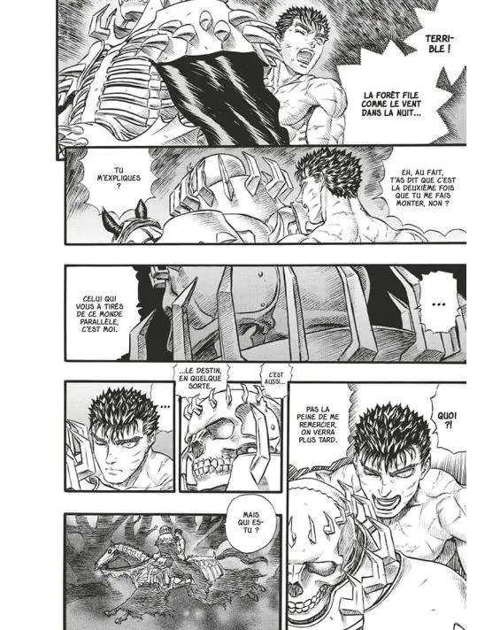 Le cadre est posé pour passer à un nouvel arc scénaristique. On sait dorénavant pourquoi Guts est marqué avec un oeil ainsi qu’un bras en moins. A partir de là, le héros voyage seul et anéantit en route les criminels et monstres. Ainsi on débute avec un village où des elfes meurtriers sévissent. Puk n’est pas du tout le même. C’est bien de le retrouver à nouveau car il apporte de l’humour et détend l’atmosphère. Même le visage du héros se déride à l’occasion. Et on voit que son physique a changé depuis le premier jet envoyé à l’éditeur. On peut le lire à la fin de l’ouvrage. Il avait des expressions proches de Nicky Larson. L’évolution est plus flagrante et surtout beaucoup plus sombre. L’impact est plus fort et dense. Dorénavant, on est encore plus addict à un gars croyant être un justicier détruisant tout le mal sur son passage. Un vrai gentlemen meurtrier au service des femmes, des enfants, des pauvres et des braves. La dichotomie est si importante qu’on souhaite qu’il gagne contre tout. Et après, il continue son chemin comme un chevalier blanc errant. Un schéma que l’on retrouve dans bien des films et des séries. Jusqu’où ira notre héros? A nous de la découvrir dans l’ensemble des tomes qui nous attende.
