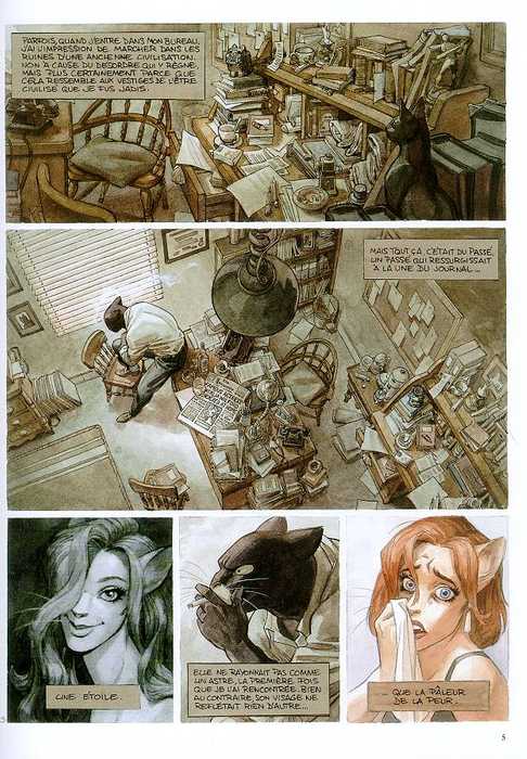Dès la première case, le ton est donné. Nous sommes dans un polar. Avec les ingrédients habituels: un meurtre, une grande ville américaine rongée de l’intérieur, une belle poupée salement amochée. Jusqu’au détective privé – un chat baptisé Blacksad – qui contemple, désabusé, l’agitation de la grande ville en soulevant légèrement le store. Bref, du classique, se dit-on. C’est à moitié vrai. L’intrigue reste en effet dans la grande tradition du film noir. Mais le graphisme, lui, nous cueille comme un méchant uppercut au détour d’une ruelle sombre.