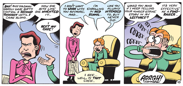 Tom Spurgon, rédacteur en chef de « The Comics Reporter » propose une présentation de cette femme en préface : « Pourquoi « Femme rebelle » n’est-elle pas qu’une simple bonne biographie en bande dessinée? Parce que Peter Bagge traite la vie de cette personnalité hors du commun comme s’il s’agissait d’une personne lambda, avec ses problèmes, sa haute estime d’elle-même et les nombreux désirs qu’elle cherche à satisfaire tout au long de son existence. Bagge fait de Sanger un personnage de comédie, sujet à des aspirations et à des besoins contradictoires, affrontant sans cesse la tempête au lieu de chercher à passer entre les gouttes. Bagge révèle aussi certains aspects de sa personnalité, au moyen d’apartés destinés au lecteur et de bulles digressives, comme quand Sanger abuse de la naïveté de sa camarade de classe en l’incitant à laver la vaisselle à sa place; quand elle fait un doigt d’honneur mental à son mari hébété en lui annonçant son intention de vivre selon les principes de l’amour libre; ou encore quand elle tire la langue comme une écolière et répond de façon impertinente à l’inspecteur des Postes (et censeur) Anthony Comstock. Bagge ne ménage pas son image en incluant l’interview désastreuse qu’elle donna au journalisme Mike Wallace à la fin de sa vie et dont elle espérait une sortie sous le feu des projecteurs plutôt qu’une dernière occasion de défendre publiquement sa cause. De même, il conclut sa biographie par une scène d’une crudité sans pareille, dans laquelle la réplique finale est à la fois déchirante, brutale et hilarante » (p. 11).
