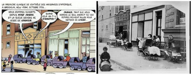 La couverture est très significative du combat mené et de ces opposants. Dans les premières pages on nous donne plus d’information sur ce qu’elle signifie. « James Curley, le maire de Boston, dans le Massachusetts, qui a popularisé l’expression « Interdit à Boston », a empêché Margaret Sanger de s’exprimer en public dans cette ville durant les années 1920. Mais, en 1929, au cours d’une de leurs « sauteries » annuelles, les organisateurs de l’iconoclaste Ford Hall Forum élaborèrent un stratagème pour une Sanger intervienne tout en respectant scrupuleusement l’interdiction : elle se trouvait sur scène, bâillonnée, tandis que l’historien Arthur Schlesinger Sr (à gauche) lisait en son nom un discours qu’elle avait elle-même rédigé. Le célèbre avocat des droits civils, Clarence Darrow (à droite), pris ensuite la parole ». (p. 6)