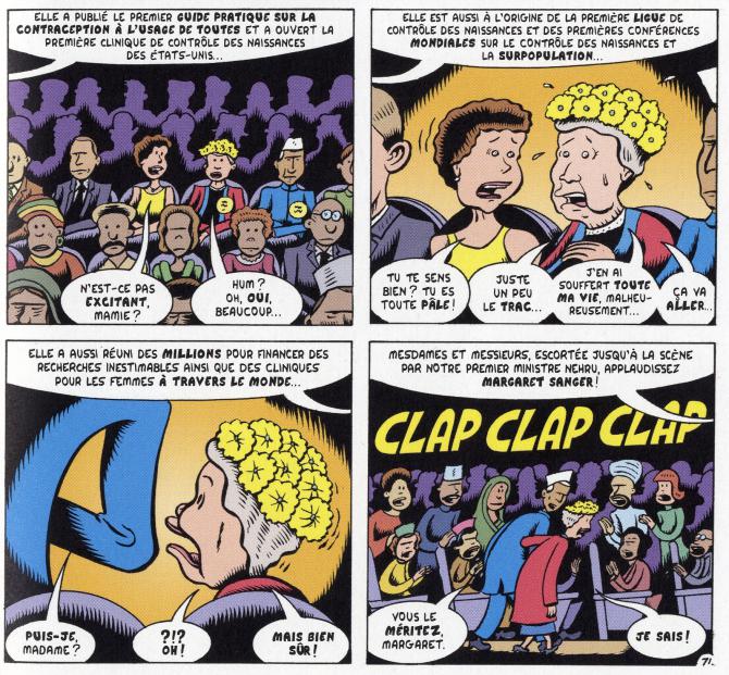 Peter Bagge a essayé de mettre tout ce qu’il a pu trouver car il s’est vraiment documenté en amont. Il passe au-dessus de ceux qui essaient de ternir l’image de cette femme qui a osé changé le rôle de fabrique à bébés en femme libérée qui peut choisir. Car ceux qui veulent noircir le tableau sont encore trop nombreux. Les biens pensants n’ont pas disparu après le XXe. Alors j’applaudis le choix audacieux du dessinateur en choisissant cette femme important qui n’était pas très commode et qui avait des idées très arrêtés. D’ailleurs, il ne fait de compromis avec la réalité. Le comics se lit très bien et trouve le bon rythme entre récits entrecoupés d’action. Son style dans la verve de bd américaine s’identifie tout de suite avec le dessin assez cartoonesque et des couleurs vives. L’introduction de Tom Spurgon (rédacteur en chef de The Comics Reporter), les précisions historiques du scénariste et la note d’Angeline Durand-Vallot, maître de conférences en civilisation américaine à l’université de Lyon 1 apportent beaucoup d’informations très intéressantes dont il serait dommage de se passer. Une biographie très complète s’étend sur une vie intense qui montre sa richesse et sa complexité. Et puis, c’est intéressant d’avoir un regard d’homme sur un combat de femmes. Beaucoup se sont opposés de façon très virulente et parfois violente à elle.