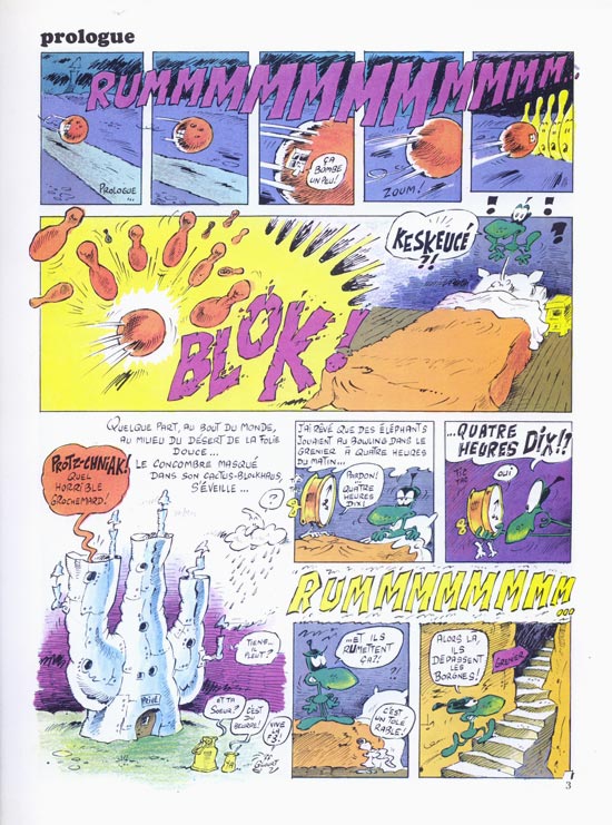 Autour et dans le cactus blockhaus dressé au milieu du désert, s’agitent des personnages récurrents, Chourave, fidèle copain, un soleil à gros nez, des éléphants ou un réveil souvent tabassé. Après Les aventures potagères du Concombre Masqué, ce sera Le retour du concombre masqué avec Archimède qui habite le cerveau du légume. Celui-ci démasqué et vieilli racontera Comment devenir maître du monde avant d’être chef de gare dans La vie quotidienne du Concombre Masqué guettant le passage de baleines des sables. Une carte au trésor laissée par son aïeul l’amènera À la poursuite du Broutchlague Mordoré génie sorti d’une lampe à souder. Il luttera contre un cinglé transformant ses adversaires en patates et le vaincra dans le Concombre contre le Grand Patatoseur.