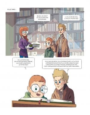 La mise en forme est assez sympathique et chaleureuse. Emanuele devient Manu et a rajeunit. Il a un petit air d’aventurier comme dans Docteur Who joué par David Tennant. A la bibliothèque, il rencontre un gamin curieux et une très jolie bibliothécaire. Ils vont l’aider au début de sa recherche. Il découvre Ségurant, un chevalier sans dame et sans quête amoureuse. Il cherche uniquement la gloire et l’honneur. Pour être certain de cela, le brave Manu voyage délaissant sa famille. Pour présenter tout cela, c’est un savant mélange entre bande dessinée et d’album jeunesse. C’est assez nécessaire. Contrairement à ce que peuvent lire les jeunes lecteurs entre 8/10 ans, on trouve des quêtes d’un chevalier, fort, brave qui gagne tout facilement sans trop de sacrifice. La quête ici est de retrouver des traces de l’histoire originale donc l’approche est très différente et singulière. Même si les choses avancent relativement vite, on se laisse porter jusqu’au happy end. Aucun doute que cela mettra l’eau à la bouche de ceux qui rêve de devenir archéologue ou Indiana Jones. Pour les parents, eux aussi pourront s’enrichir avec plus de donner avec les bouquins et le documentaire sur Arte.