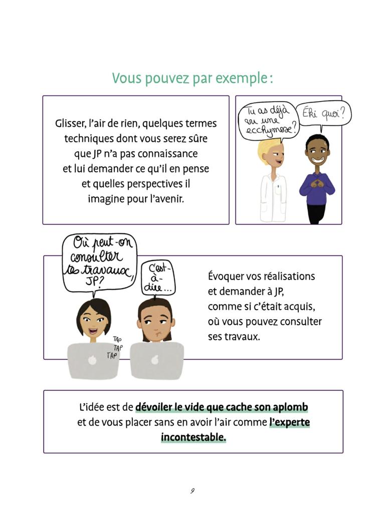 Sous forme de saynètes humoristiques, cet ouvrage aborde les concepts de mansplaining, quand l’homme explique à une femme comment s’exprimer et comment penser de manière condescendante, de manterrupting, quand un homme coupe systématiquement la parole à une femme qui tente de s’exprimer, le manspreading quand l’homme prend ses aises dans les lieux publics notamment dans les transports en communs.