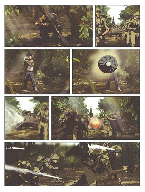 « Valse avec Bachir » est un documentaire d’animation autobiographique réalisé par l’israélien Ari Folman, sorti en 2008. A la suite de la production, le projet d’une bande dessinée apparaît. Une autre façon de travailler avec les images. Car Ari Folman et David Polonsky ont du inventer une nouvelle façon de raconter, avec moins d’images qu’il faut sélectionner et faire toujours sens. La démarche nous est expliqué en fin d’ouvrage. C’est très instructif. En effet, ce n’est pas courant d’adapter un film d’animation en 9e art. Partagé avec le lecteur les réflexions et le cheminement jusqu’à la réalisation. Il y a une volonté de partager ce récit très personnel et réaliste parsemé d’hallucinations. Le réalisateur partage une expérience d’une guerre très traumatisante. Pour qui cela ne le serait pas? Sans pour autant culpabiliser. Est-ce une construction mentale toutes ces quêtes? ces morts? ces blessés? Il faut d’autres témoignages pour se prouver que c’est vrai. Une blessure qui prend de l’ampleur car la vraisemblance est là. Il est passé d’un jeune homme innocent à un soldat tuant. A partir de quand l’horreur devient acceptable et ordinaire? En tout cas, le lecteur est là. La bd se termine sur des images chocs. De la représentation à travers des images d’un animé on passe à des photos de cadavres. Faut-il plus de mots pour nous toucher? Même si nous ne maîtrisons pas tout le contexte politico-historique d’Israël et du Liban à ce moment là, on voit concrètement les effets des conflits armés. Surtout que le message reste toujours présent car les guerres ne cessent jamais.