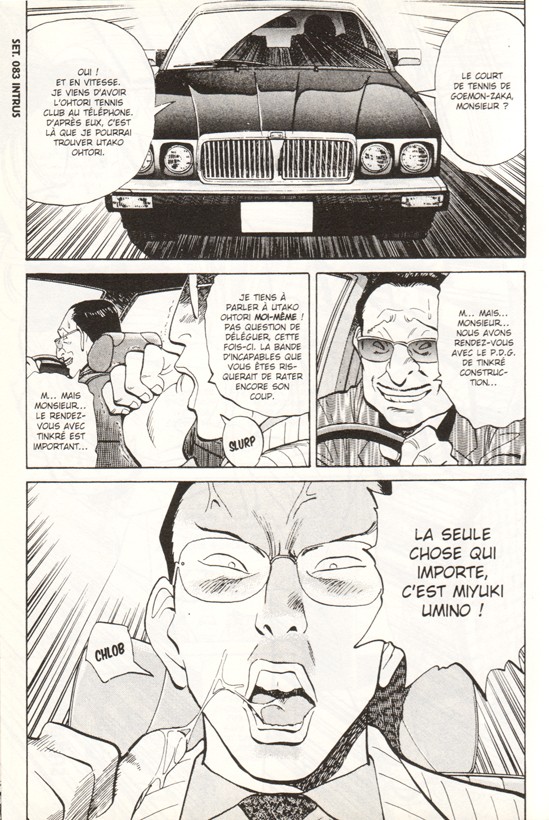 Quand on lit « Happy! », il faut garder son calme. Tout tourne autour du personnage Miyuki. Elle incarne parfaitement le rôle de la victime. Chôko fait tout pour que le public la déteste, pour ne pas qu’elle puisse avoir de sponsor, de logement, de soutien jusqu’à la peine de coeur. Naoki Urasawa la prend comme outil de perversion continue. Elle fait ça parce que c’est quelqu’un de fondamentalement mauvais avec forcément du narcissisme et de l’égocentrisme. Les atouts sont nombreux avec le charme, la facilité de s’exprimer et l’hypocrisie. Elle arrive à dresser pièges après pièges. Malgré tout ça, Miyuki arrive à avancer grâce à sa détermination et ces quelques amis. Elle gagne un premier match à la coupe Cléopatra ce qui n’est pas pour plaire à notre manipulatrice en chef. Par chance, un nouveau dilemme se pose. La victime est face à la question très complexe. Doit-elle perdre exprès pour amasser plus d’argent que nécessaire ou gagner la compétition pour une petite somme mais être honnête. Quelle aubaine pour toute personne tordue. Cette dualité est très marquée et c’est assez insupportable. Entre une vraie peste et une vraie cruche, tout est fait pour sublimer les oppositions. On n’oublie pas la mère de Keichiro totalement égocentrique et antipathique. Elle s’oppose à Kiku qui a toujours le coeur sur la main. Les mecs ne sont pas en reste avec son lot de pervers, vicieux, de malhonnête et quelques gentils. Ces derniers ce comptent sur les doigts d’une main. Heureusement que nous avons quelques scènes de matchs de tennis. Tout est dans l’exagération, dans le cliché et ça tape un peu sur le système. Surtout que c’est répétitif sans trop d’avancée dans le scénario.
