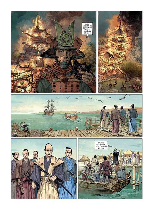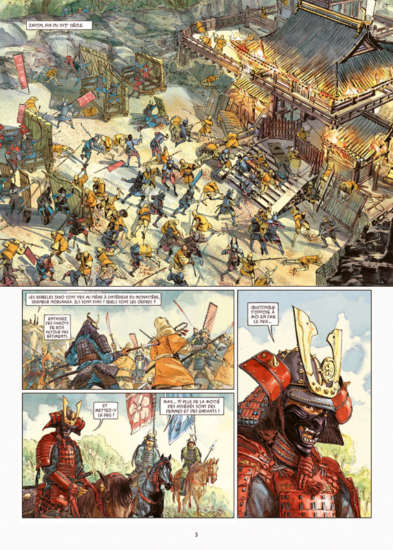 Nous sommes loin de la vision proposer dans le manga « Le chef de Nobunaga » de Mitsuru Nishimura et Takuro Kajikawa. Les mangakas ont voulu faire une approche réaliste loin du cliché d’un Nobunaga meurtrier et cruelle. Thierry Gloris décide de proposer une autre vision. D’ailleurs pour poser le cadre de la série, il passe vite d’un contexte à un autre sans vraiment de lien au début. Puis les changements de point de vue se poursuivent. On voit les périples de la vie d’Oda, la progression sociale de Yasuke et les stratégies des ennemis. Tout le pays est en tension et les morts s’accumulent dans les deux camps. Tout cela est l’occasion surtout pour l’instant de découvrir le héros principal. Un homme noir au pays des asiatiques à des quoi bouleverser les codes. Emiliano Zarcone propose un graphique assez standard pour ce genre de récit. Il respecte les codes avec une forme d’illustration de propos avec quelque chose de statique. On a envie tout de même de poursuivre pour savoir quel rôle va jouer ce personnage dans l’avenir du Japon.