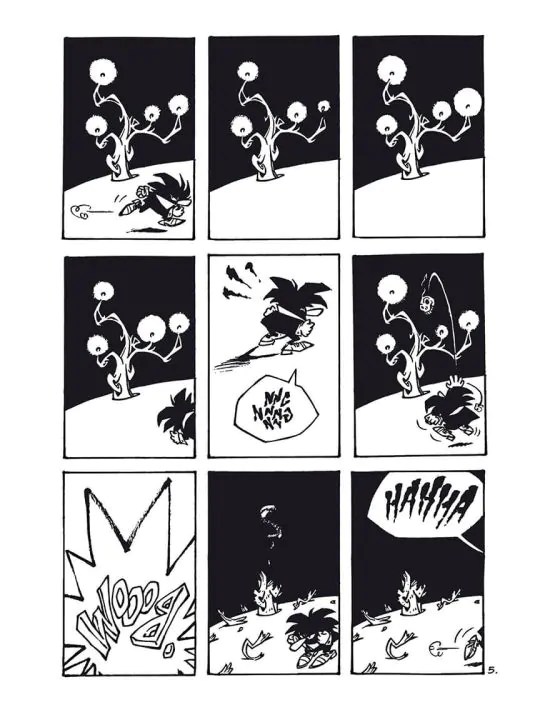Robin nous montre son savoir faire dans le 9e art. D’une part, il a créé un album sans aucun texte. Et l’album ne s’adresse pas à un public enfant. Et d’autre part, en jouant ingénieusement du contraste noir et blanc. Ainsi cela insuffle une dynamique spécifique. Le bédéaste joue avec des gros plans pour plus d’impulsion et voir les expressions de la teigne. On voit bien ainsi qu’elle prend un plaisir dans la destruction et la nuisance à son prochain. Un voisin très flegmatique résiste à ces attaques et garde le sourire. Donc, il amplifie les tentatives de meurtres en vain. Là se cache une succession de gags avec des chutes similaires. Il aurait pu aller vers des scènes très trashs et violentes. Néanmoins, il reste dans des approches cruelles sans sang qui coule ou tête qui explose. Un savoir-faire qui n’est pas donné à tout le monde.
