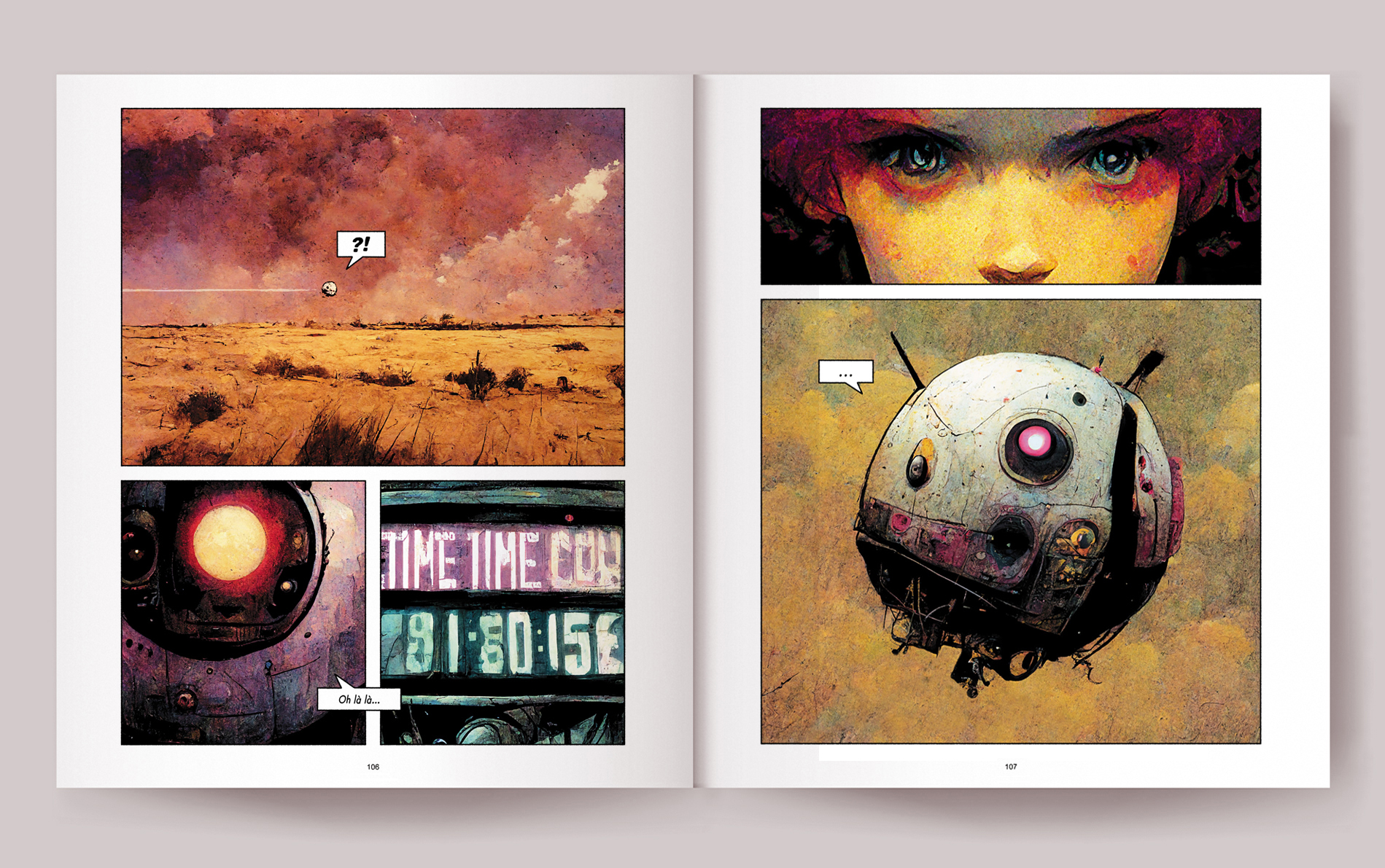 Si le scénario d’« initial_A. » n’a pas beaucoup bougé à la suite des images que j’ai générées, il y a cependant eu des digressions grâce à l’IA qui ne seraient pas apparues si j’avais dessiné à la main, comme d’habitude. Car malgré tout, un « dialogue » s’installe entre l’homme et la machine : bien qu’elle reste un outil, il se passe des choses inattendues qui amène l’imaginaire vers un ailleurs. La machine ne fait rien toute seule, ce qu’elle produit est dû à l’intervention de l’homme, elle ne prend pas les rênes, l’humain reste maître à bord. En me confrontant à l’outil, je ne me sens pas dépossédé de mon énergie créative. En revanche, la vitesse avec laquelle la machine réagit, sa rapidité d’exécution n’est en rien celle de l’homme et cela engendre une sursollicitation. Je mets environ douze mois pour faire un album. Pour initial_A., j’ai consacré deux mois à la génération d’images et quatre mois au travail de montage, mais la fatigue engendrée est bien plus importante, car le calendrier de réalisation est plus court et donc plus intense. J’ai ressenti une énergie de travail assez inhumaine. C’était très étrange, donc passionnant à expérimenter.