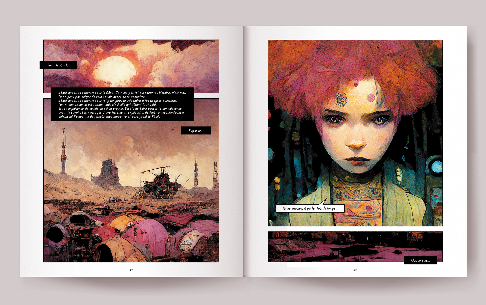 Alors, le dessinateur que je suis se connecte donc en septembre 2022 sur le programme Midjourney dont tout le monde parle sans l’avoir essayé. Cette puissante IA de génération visuelle traduit du texte en image avec une « pertinence » déconcertante… L’outil est puissant. Un déclic se produit… Quelque part entre terreur et émerveillement. Le mysterium tremendum, en quelque sorte… La base de tout processus artistique. En travaillant sur ces générations d’images « artificielles », j’ai alors cherché de manière empirique une méthode pour apprivoiser les algorithmes afin de trouver la justesse visuelle, les bonnes descriptions, les angles de vue, la qualité d’expression verbale qui vont conditionner la précision des scènes imaginées, le langage de la forme picturale et de la composition d’univers… C’était vertigineux… En quelques semaines, j’avais prompté, généré, trié, sélectionné, archivé plusieurs milliers d’images. Toutes singulières, inédites et surprenantes… Je me suis alors rendu compte que le propos de mes questionnements, à cet instant, était exactement le même que dans le scénario de « initial_A. » que j’avais écrit deux ans plus tôt. Explorer la frontière… Il me restait à construire les pages. Une à une, pendant cinq mois. Et à chercher dans cette architecture invisible d’entre les cases, comment faire dialoguer ces images entre elles avec mon scénario. Faire mon métier d’auteur de bande dessinée, tout simplement, mais d’une façon nouvelle et inattendue. Mais, où est la frontière ? Dans cette hybridation combinatoire, qu’est-ce qui est humain et qu’est-ce qui ne l’est pas ? La réponse m’est apparue assez clairement. Ce qui est humain c’est mon désir de raconter cette histoire, à cet instant, de cette manière et faire dialoguer le fond et la forme d’une façon inédite. Un récit de science fiction dessiné avec un outil de science fiction, voilà l’idée qui a déclenché le processus créatif d’ »initial_A« .