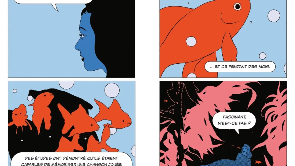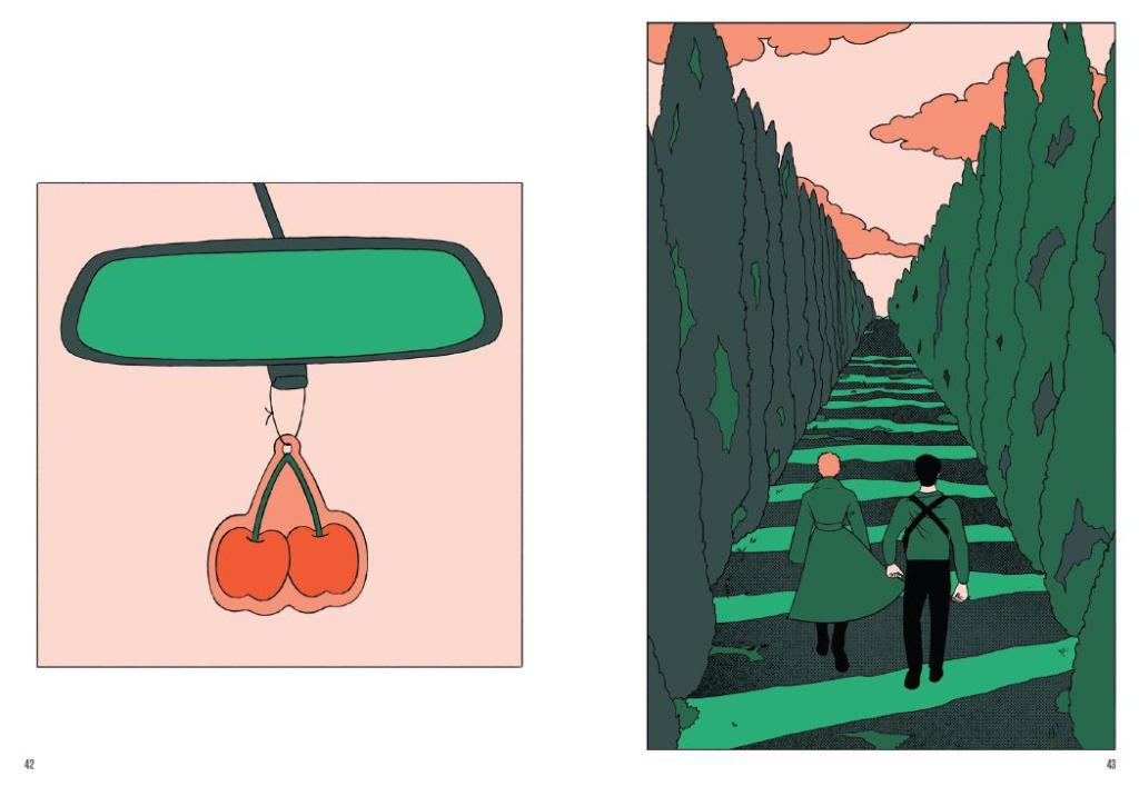 On prend notre temps pour admirer les pages. Les références à la bande dessinée des années 70, du cinéma italien… sont ici et là. Le tout est très cohérent. On sent le travail très précis pour emmener le lecteur dans un univers maîtrisé du début à la fin. Elle varie les plans ce qui permet les changements de rythme et d’impulser une vraie dynamique. Comme par exemple ces pages noires avec une petite images pour montrer un souvenir avec un perle rouge. C’est très parlant et évocateur. un petit bijou qui donne envie de suivre la créatrice et aussi une maison d’édition grâce à ce momentané un peu fou.