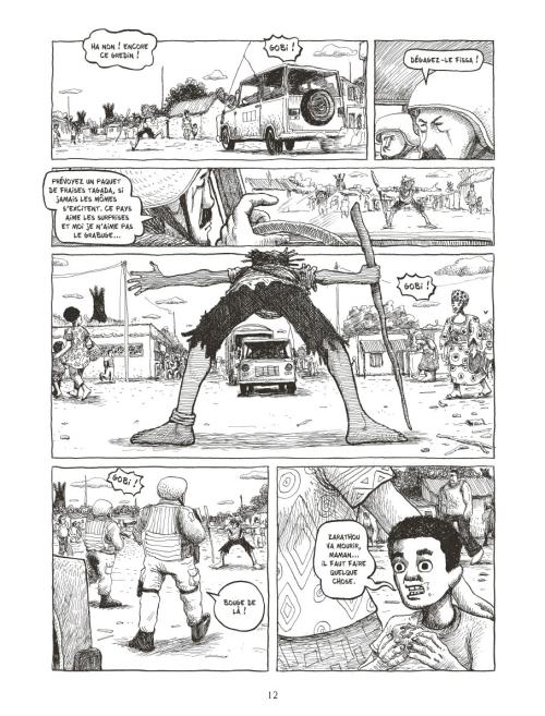 Mais notre héros lui ne souhaite pas faire que des briques en terre. Il se lance pour trouver une place de dessinateur de trompe-oeil. Un autre artiste prend les devants et met des couleurs sur des murs avec un réaliste saisissant. Qui est Zad? Un artiste qui fait rêver Kandji depuis qu’il est petit. Adjim Danngar valorise ces instants puisque la bd est en noir et blanc. Juste les dessins de Zad sont en couleurs. Un contraste visuel très intéressant et percutant. Le trait très fin et précis contribue à créer un aspect réaliste et onirique. Le bédéaste donne à ces personnages beaucoup de relief et les rend attachant ainsi que réaliste. Toute la société est dépeinte. Même dans l’aménagement urbain où l’on découvre aussi bien la campagne que la ville. Une autre façon de vivre que l’on ne retrouve pas souvent dans le 9e art. Notre curiosité est assez touché pour avoir envie de poursuivre.