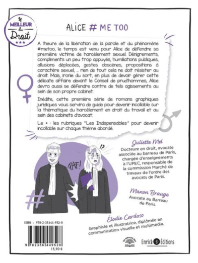 A l’heure de la libération de la parole et du phénomène #metoo, le temps est venu pour Alice de défendre sa première victime de harcèlement sexuel. Dénigrements, compliments un peu trop appuyés, humiliations publiques, allusions déplacées, gestes obscènes, propositions à caractère sexuel, … rien de tout cela ne doit résister au droit. Mais, ironie du sort, en plus de devoir gérer cette délicate affaire devant le Conseil de prud’hommes, Alice devra aussi se défendre contre de tels agissements au sein de son propre cabinet. Inédite, cette première série de romans graphiques juridiques vous servira de guide pour devenir incollable sur la thématique du harcèlement en droit du travail et au sein des cabinets d’avocat.4e de couverture