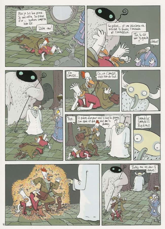 On trouve des propos déplacés : « Tu m’entends, pute?!!… Je t’ai dit de me faire voir ton cul!! » (p. 14). Cependant la demoiselle n’a pas besoin d’un chevalier servant pour tout régler. Elle sait se servir de son cerveau et en plus cela peut rapporter de l’argent au passage. Il ne faut jamais sous-estimée une demoiselle. Il y a toujours des références à droite à gauche à la culture populaire. Ainsi des automates font référence à ceux de Vaucanson. Ils sont sous forme de canard et parle à un canard. Quelle jolie mise en abîme. Il faudrait mettre se passage dans le musée des Arts et Métiers à Paris.