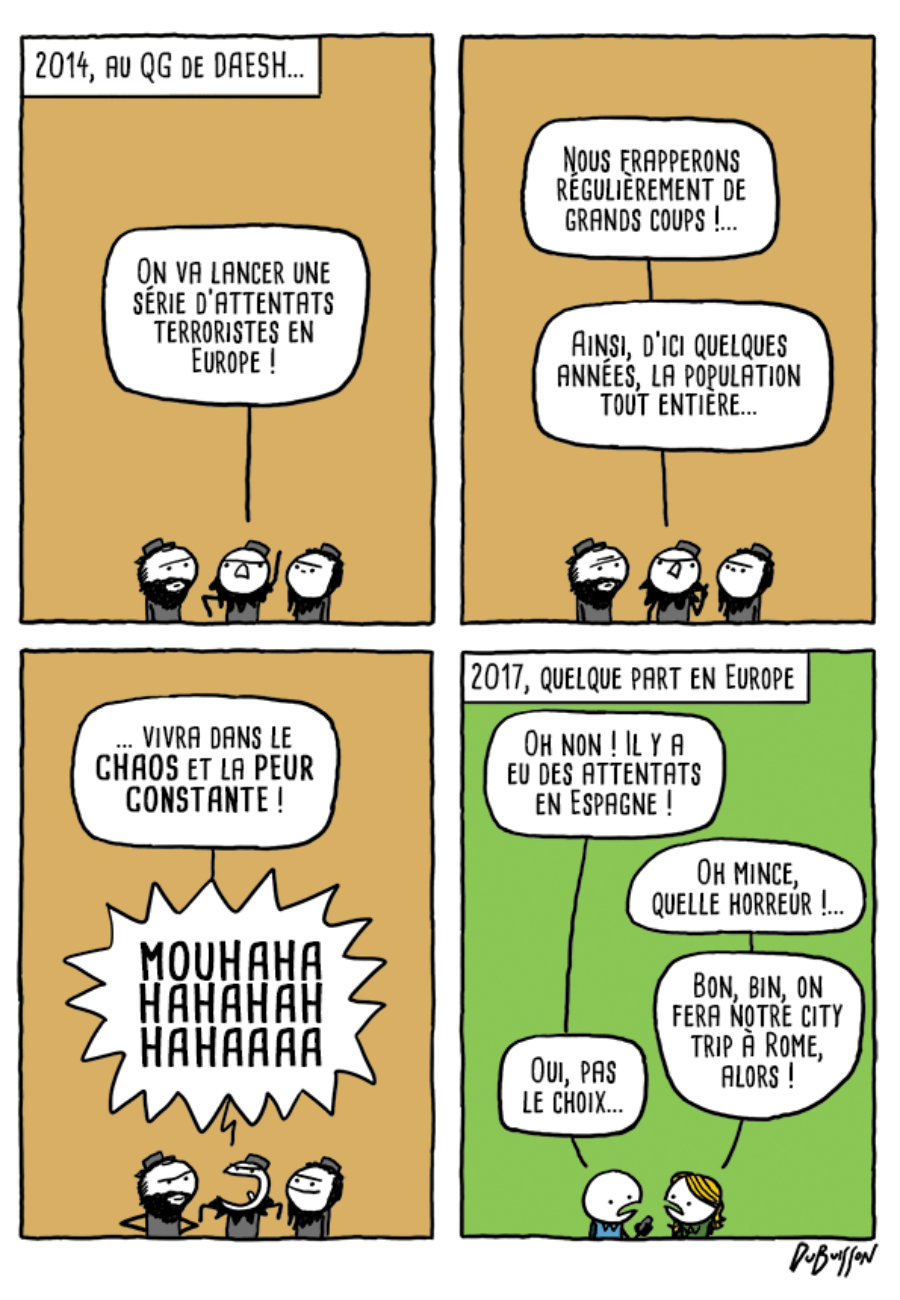 Quand on a commencé à lire la série, impossible de s’arrêter en si bon chemin. Marc Dubuisson maîtrise comme un chef l’art de l’ironie et de l’absurde. Il privilégie l’efficacité grâce à une page et quatre cases maximum. De même pour le dessin, des personnages sous forme de bâtons avec un fond de couleur. Il n’en faut pas plus. L’esprit de synthèse est très performant tout comme l’esprit critique. L’actualité est une source inépuisable d’inspiration. Par malchance, les sujets ne varient guère : racisme, misogynie, sexisme, crise écologique, Donald Trump, Emmanuel Macron, les gilets jaunes, médias sensationnalistes, politiciens clientélistes…