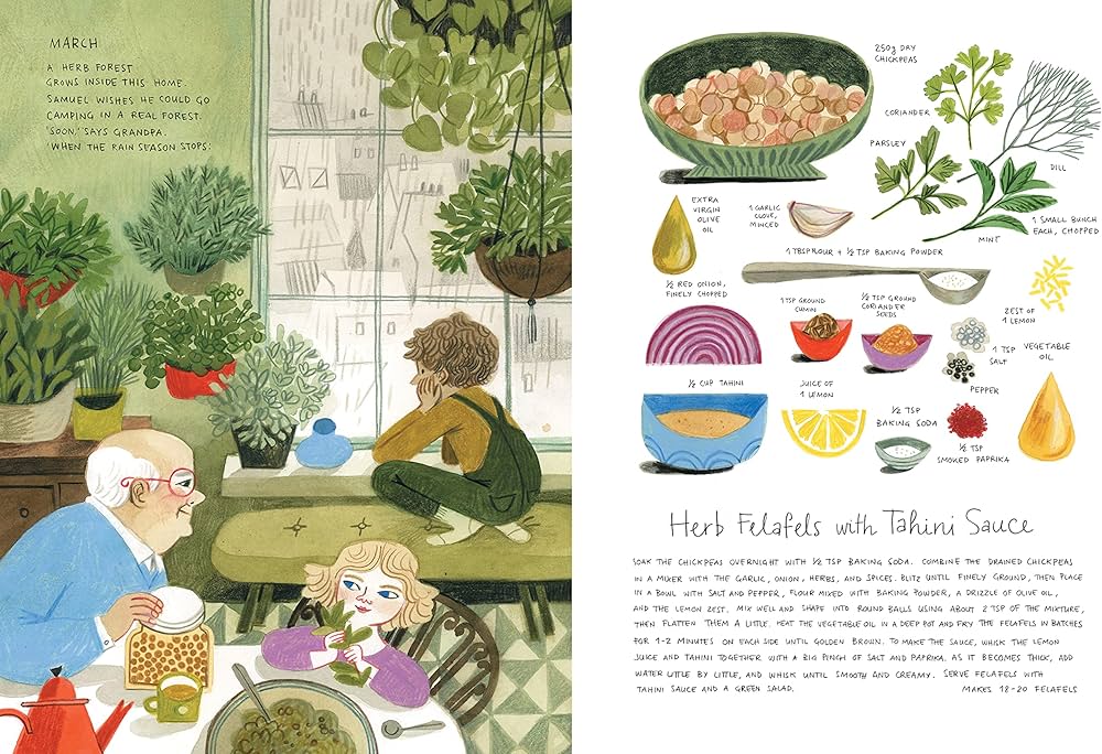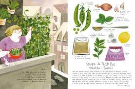 Felicita Sala propose quelque chose de simple et efficace. Elle fait un lien entre culture saisonnée et cuisine avec une approche mensuelle. La structure se fait sur une double page. D’un côté, on regarde un lieu où pousse des salades, des choux, des artichauts.. et de l’autre, on a une recette de cuisine. Bien entendu, la plupart des autres produits sont liés à l’industrialisation et au commerce internationale. Il faut du beurre, de la farine, de l’huile d’olive, du poivre, des anchois… Les dessins sont très chaleureux avec une dominante verte. La page avec les ingrédients donne à voir autrement et apporte un côté sympathique. Cela ne convaincra personne de se mettre au jardinage de proximité. C’est mignon et c’est tout. Un discours angélique qui ne pourra jamais exister.