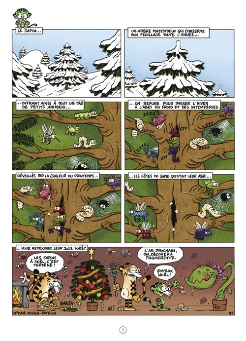 D’autres sujets ont été abordés tels le nucléaire, la pollution, le plastique… Tout est amené sur une page avec un gag. C’est assez bien construit et va à l’essentiel. Midam et son équipe arrivent très bien à synthétiser les données et y introduire de l’humour. On retrouve le fameux panda de l’ONG, la WWF. Une nouvelle fois, on remet en question ces actions et qu’elles soient adaptées au milieu. Le niveau est un peu inférieur aux tomes précédents. Pourtant, on se laisse porter par cette légèreté qui incite à développer notre esprit critique. Mais avec moins de cruauté et plus de simplicité. Espérons que le dernier tome soit plus incisif pour sensibiliser à la bonne cause. N’oublions pas que Grrreeny doit sa couleur verte à des déchets nucléaires.