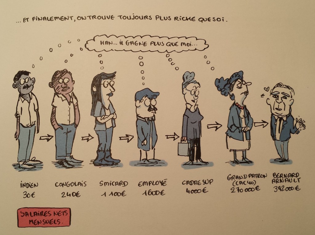 Parfois la sociologie peut faire peur. Mais pour Marion Montaigne, c’est un défi de le rendre accessible au plus grand nombre. Elle a déjà à son compte « Tu mourras moins bête », « Dans la combi de Thomas Pesquet » ou « Nos mondes perdus ». Et bien entendu, le résultat est surprenant, drôle et pédagogique. Elle emmène son lecteur avec le couple de sociologu Michel Pinçon et Monique Pinçon-Charlot. Leur sujet de recherche est sur les riches, leur mode de vie, leur rapport au monde, la gestion de leur argent, leur rapport au développement de son réseau… Pour bien comprendre ces mécanismes et leur essor, on suit un couple qui a gagné au loto. Indubitablement leur vie à changer et il ne peut en être autrement. Le côté décalé avec ce dessin très singulier rend la lecture d’autant plus intéressante. Et elle souligne aussi l’idéalisation de l’argent par rapport aux politiques par exemple. Etre nez avec une cuillère en argent donne systématiquement tout un lot de privilège que ceux au pouvoir vous aideront à conserver. Et en cas de souci budgétaire de l’état, on fera tout porter sur la masse d’en bas. D’ailleurs, n’est-ce pas grâce à des gens friqués qu’ils peuvent gagner leur croûte modestement. « Dans ces conditions, il n’est pas étonnant que les politiques ne veuillent pas changer les choses. Ils ne peuvent concevoir un autre monde que celui régi par le néo-libéralisme basé sur l’endettement, la baisse des dépenses et la politique de rigueur. Or la rigueur, c’est justement ce que veulent les marchés. Car ils spéculent sur la dette. Mais si la dette a augmenté c’est notamment pour sauver le système bancaire (et ses dérives) pendant qu’on accumule les manques à gagner dûs à dix ans de cadeaux fiscaux. Sans, parler des 80 milliards d’euros cachés en Suisse par des familles françaises. Bref, si on voulait vraiment, on saurait où trouver l’argent. Mais tant que la logique économique restera la même… A savoir la recherche du profit au détriment de l’humain.. rien ne changera. » (pp. 130 – 131).