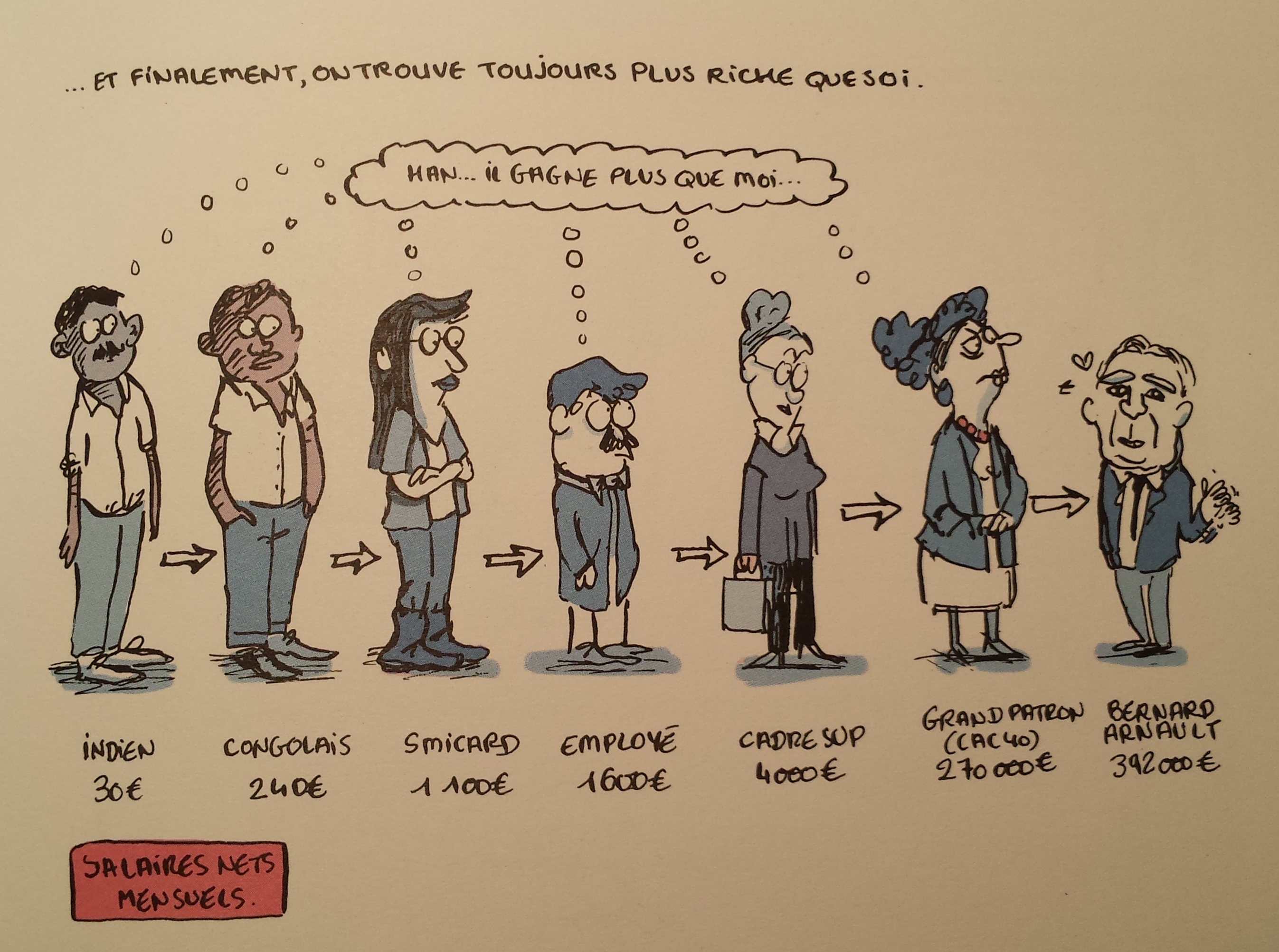L’idée de méritocratie continue à perdurer comme un mythe. « Le mérite, c’est ce qu’on fait croire, mais en fait, dans la vie, on mérite des chances dont dispose la classe à laquelle on appartient » (p. 118). Une précision qui change bien des choses. Ce n’est pas qu’il n’est pas possible de changer de caste sociale. C’est juste rare, juste quelques exceptions. « Jusque dans les années 50, on s’entraidait en famille et entre classe. Le groupe était important…C’était le bon vieux temps et Dépardieu jouait dans Germinal. Marx parlait d’une « conscience de classe » possible, grâce à la mobilisation et la lutte. Mais aujourd’hui, la société encourage plutôt l’individualisme, la concurrence et la compétition avec des effets plus ou moins néfastes. La classe ouvrière subit même un individualisme « négatif » car elle a perdu les liens de solidarité qui la caractérisait. Les classes moyennes sont plutôt dans un individualisme dit « positif » car finalement plus épanouissant, apportant une forme d’indépendance. Les riches eux, s’ils sont dans l’individualisme et la compétition dans l’idéologie, sont dans la pratique, tout à fait collectivistes et mobilisés… entre eux et pour eux. » (pp. 118-119).
