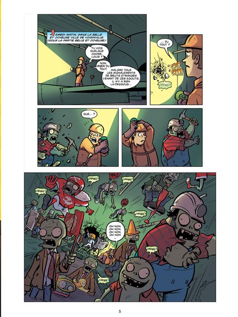 Dès le début, on rentre dans l’action. Tom Apic et Patty doivent faire face à l’arrivée nombreuses de zombies. Ils sont très nombreux et motivés pour dévorer de la cervelle. Les gamins refusent de mourir et il faut trouver des alternatives à leurs attaques. Grâce à Dave le Dingo qui a pris des initiatives dans son coin, leur vie est sauve. Il a modifié des plantes pour agresser ces morts vivants. Entre les tournesols, les plantes carnivores, les petits poids, les pastèques… ils utilisent leurs atouts et le soleil pour combattre. La nature possède des ressources incroyable.