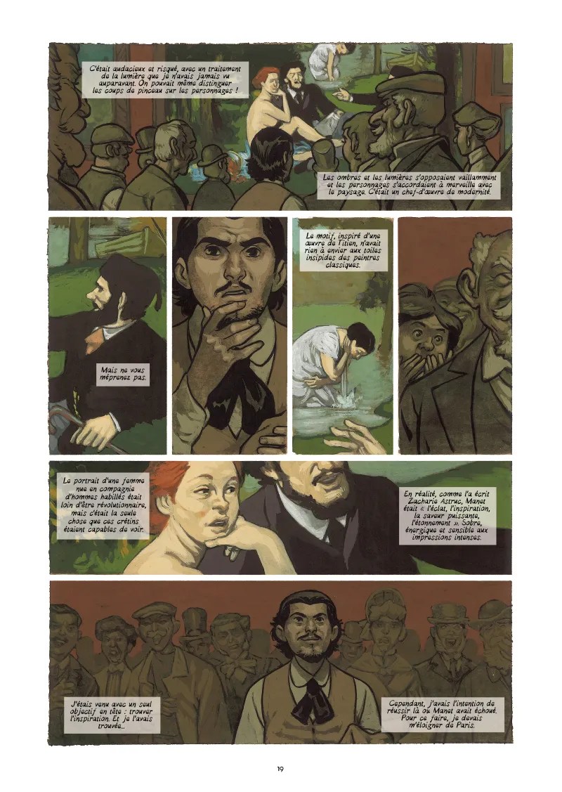 Salva Rubio retrace avec précision les grands moments de la vie de l’artiste aussi bien les échecs que les réussites. Il n’oublie de mettre le contexte politique et social de la France au 19e siècle avec les conflits armés. Il souligne les conditions encore plus difficile de la femme qui doit se débrouiller pour avorter tout en gérant le logis, les repas, le chauffage.. Avoir beaucoup d’enfants pour les plonger dans la pauvreté n’est pas un souhait de parents. Même si Clémenceau reste peu présent, il est là comme les amis fidèles avec Bazille, Pissaro, Renoir… Il explore tous les champs essentiels pour rester fidèle à la réalité.