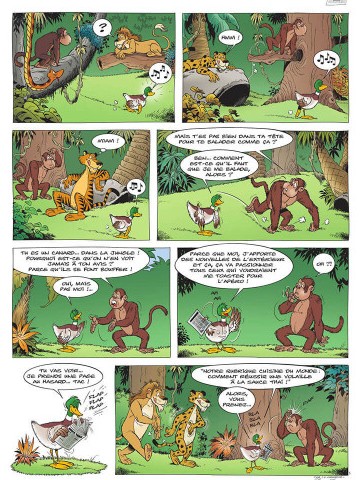 Au début, on était surpris que ce genre d’album se fasse sans avoir Daniel Cazenave au scénario. Que l’on se rassure, il apparaît dans le & Co. Un panel assez grand qui a l’habitude des gag en une page. L’esthétique de Pico a quelque chose de dérangeant. Les animaux de la jungle comme le lion, le tigre ou l’éléphant marchent sur deux pattes. Déjà, cela change leur morphologie et ensuite c’est étrange qu’ils souhaitent ressembler à des humains. D’une part, ils ont conservé leur instinct primaire car ils désirent dévorer le canard. Le personnage principal propose de découvrir les nouvelles du monde à travers son journal. D’autre part, ils parlent la langue des hommes et maîtrisent parfaitement tout le vocabulaire sur la bourse, les réseaux sociaux et autre. L’absurdité de la situation est censée est drôle. Bien que les sujets soient assez variées avec même quelques gags sur l’écologie avec le réchauffement climatique par exemple. Mais au final , on s’ennuie. Faut-il peut-être être un enfant pour apprécier ces blagounettes? Par chance, c’est un tome isolé.