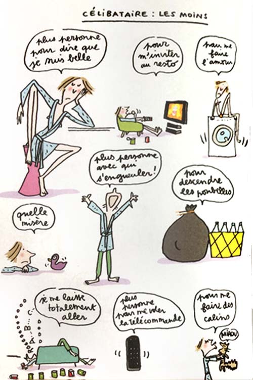 La deuxième chose qui nous vient à l’esprit est son travail d’illustrations pour la collection « Les paresseuses » à Marabout. On retrouve un peu cette esprit avec le récit de nana célibataire et en couple. Les approches ne sont pas tout à fait les mêmes. Quand on rencontre un mec, pendant qu’ils font l’amour la femme pense si son épilation a bien été faites, si elle est assez souple pour certaines positions ou des choses du même acabit. Pour les couples, c’est plutôt savoir s’ils ont mis assez d’argent de côté pour se permettre un beau voyage à l’autre bout du monde. D’autres clichés seront plus loin explorés.