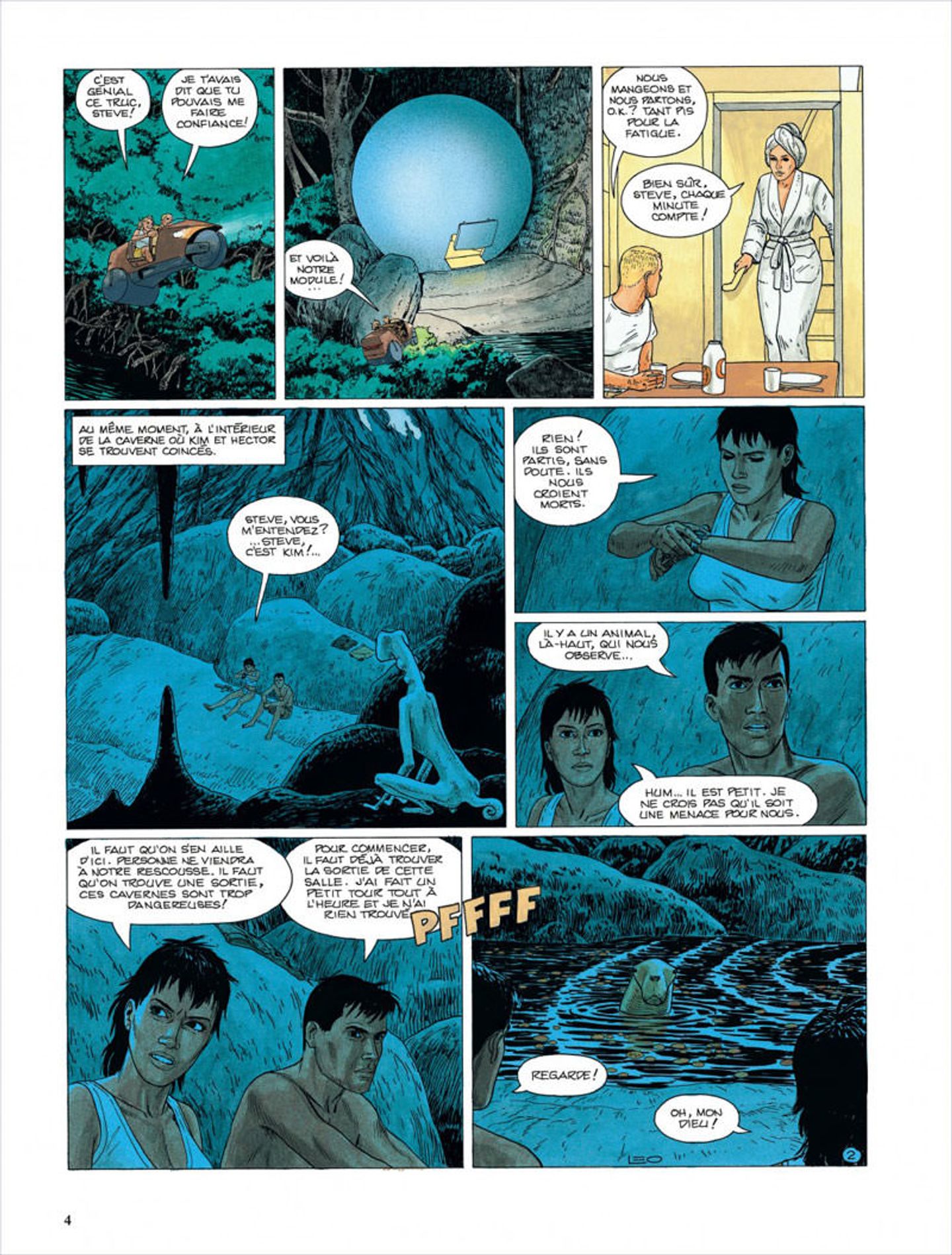 Kim et Hector continuent de chercher une sortie dans les tréfonds du sol. Ils doivent se dépêcher car des animaux pas très sympathiques souhaitent s’en prendre à eux. Une étrange boule volante les aide à prendre la bonne sortie. Grâce à deux de ces collègues, ils s’en sortent vivant. Au passage, Steve meurt bêtement. Pas le temps d’être triste ou de tirer une larme. Les personnages restent assez plats et fades comme dans les tomes précédents. Au moins comme ça, on n’a pas le temps de s’attacher à l’un deux. De toute façon, le personnage centrale est Kim. D’ailleurs, c’est pour cela que l’on a toujours le droit à au moins une scène où elle est nue. Par conséquent, on profite d’une focalisation sur son énorme poitrine. Elle est souvent bien soulignée avec son tee-shirt moulant et ils deviennent plus gros quand ils sont à l’air. Bien entendu, cela n’apporte toujours rien au récit. Juste de quoi satisfaire d’une part les clichés de la bd 48CC d’un autre temps et d’autre part les pervers vicieux. C’est toujours navrant de voir ça en 2013.