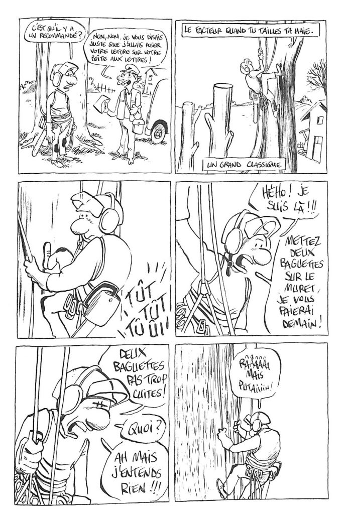 La couverture a quelque chose de très intriguant avec un avion qui s’écrase et le titre « T’inquiète ». Les éléments principaux sont tous réunis. On peut dire qu’il y a un beau travail de synthèse. Et la particularité de la bande dessinée se constate très vite une fois que nous sommes plongés dans l’histoire. Chaque personnage est très inspiré par le dessinateur lui même : Bouzard, Fabcaro, B-Gnet, Gilles Rochier et Fabrice Erre. D’ailleurs, c’est lui qui ce dessine et qui s’incarne dans cette fiction très singulière à la façon d’un cadavre exquis. Les points de vue se succèdent avec leur vision et leur pâte. Tous possède un sens de l’humour et de la dérision assez atypique.