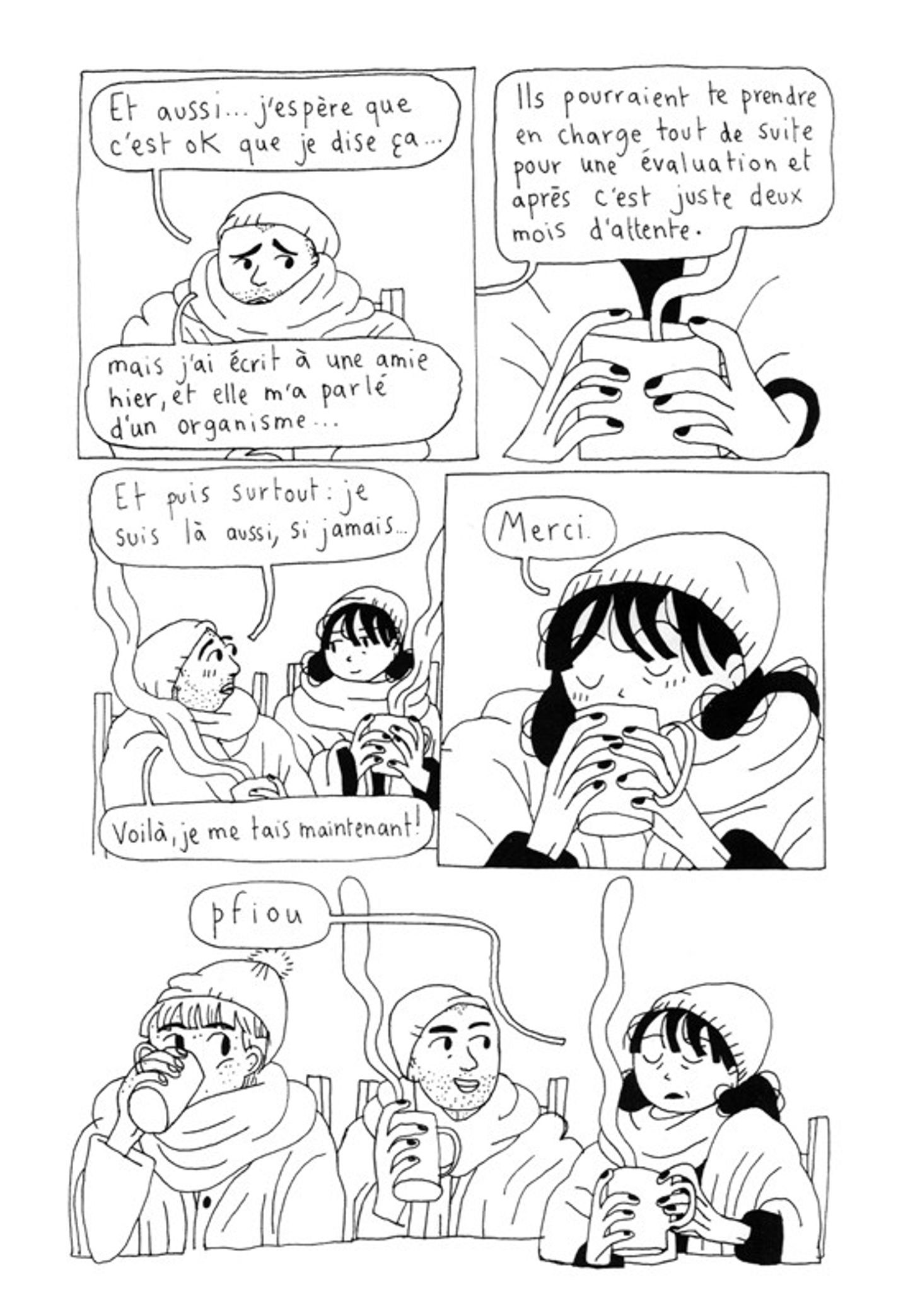Mirion Malle a toujours abordée des sujets très sensibles. Elle aborde toujours des sujets relatifs aux femmes que cela soit l’histoire du féminisme ou des souffrances plus personnelles. Dans ce récit de fiction, elle met en avant Clara. Elle a un travail avec un responsable malveillant et narcissique. Elle doit produire une bande dessinée et sa réalisation n’avance pas autant qu’elle le voudrait. La fatigue et la tristesse l’habitent au quotidien. Il faut gérer tout ce mal être qui n’arrête pas de la poursuivre. Même entretenir des relations avec des amis deviennent difficile. Comment faire comprendre aux autres la souffrance que l’on ressent? Comment l’expliquer quand déjà on ne se comprend pas? Que faire pour aller mieux? Que cela soit voir des professionnels ou soit aller dans une institution spécialisée, cela coûte trop cher à Montréal. S’isoler devient le bonne méthode pour se protéger. Quoi de plus naturel que les autres s’éloigne d’elle quand elle les ignore? Une seule fois les mots arrivent à sortir. Est-ce les premiers pas pour se sentir mieux?