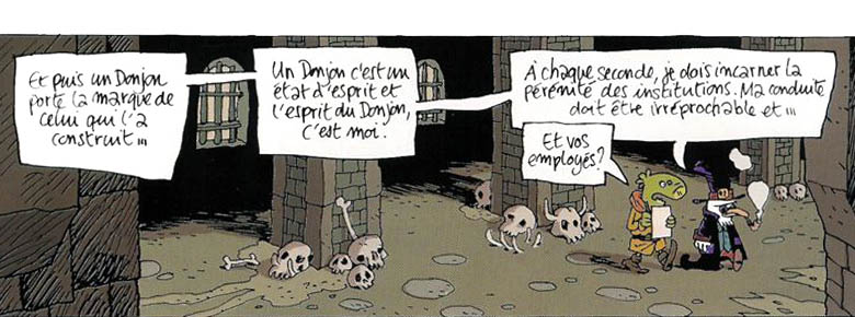 Rien ne va plus au Donjon. Hyacinthe, le Gardien, a le moral dans les chaussettes. Il y a de quoi : depuis qu’un étudiant en gestion a ouvert son propre Donjon – juste en face, en plus – la clientèle se fait rare. Mais le pire, c’est que ce petit jeune tue le métier. Chez lui, les monstres sont gentils, on sert de la barbe à papa ou des pommes d’amour aux visiteurs et les salaires sont deux fois plus élevés. Du coup, au Donjon (le premier du nom… vous suivez ?), les monstres restés fidèles font des concours de crachats pour tromper l’ennui. Quelle déchéance, tout de même… Trondheim et Sfar, les deux scénaristes, continuent à bien s’amuser. Le lecteur aussi, d’ailleurs. Ici, ils confient le dessin à Larcenet, l’auteur de Bill Baroud – qui est à l’espionnage ce que Donjon est à l’heroïc fantasy : une énorme farce parodique. Comment s’étonner que ce nouvel épisode soit l’un des plus drôles ? Et sa conclusion est sans appel : le Donjon n’est pas qu’une affaire de marketing. Non mais, ce serait trop simple !