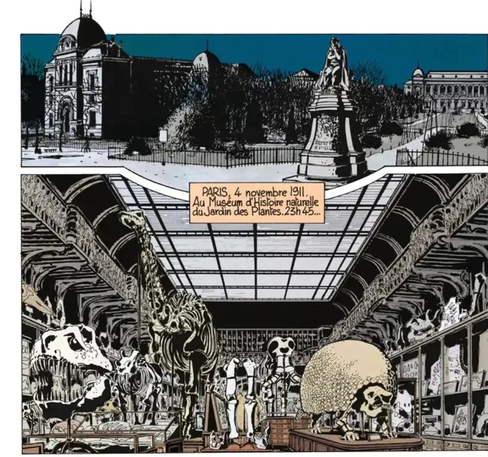 Jacques Tardi possède un univers graphique assez singulier et très reconnaissable. Sa passion pour l’Histoire se retrouve dans l’ensemble de ces créations. Par conséquent, il retranscrit assez fidèlement le Paris de 1911. A cela se combine des éléments de littérature comme les sauriens et les machines volantes comme les racontent si bien Jules Vernes. Dans une ambiance en noir et blanc, on suit plusieurs personnages qui cherchent l’argent et les biens dérobés dans une banque. Pour mettre la main dessus, tous rivalisent d’imagination. Par conséquent, la traitrise est de mise. Ainsi les rebondissements n’arrêtent jamais. Surtout que le cadre est la réapparition d’un ptérodactyle disparu il y a des millions d’années. Il tourne souvent autour du Muséum d’histoire naturelle du Jardin des plantes de Paris. Une façon de revoir ce lieu qui n’a pas trop changé surtout la galerie avec les squelettes d’animaux.