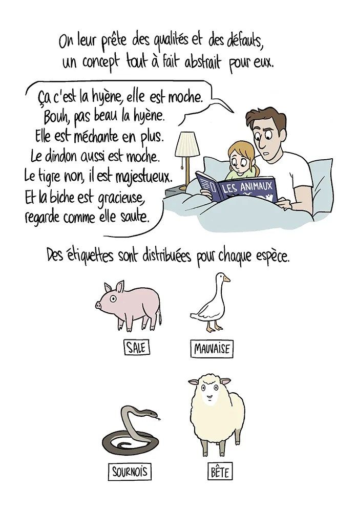 La majorité des gens aiment les animaux, et apprécie en avoir chez eux. Mais… Parle-t-on du chat sur le lit, ou du cochon dans le frigo ? Pourquoi le sort des animaux est-il aussi radicalement différent d’une espèce à l’autre ? Pourquoi un rapace nous apparaît-il comme noble alors qu’un gallinacé n’est intéressant que s’il sort du four ?