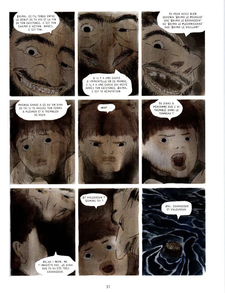 Encore une fois, Jérémie Moreau nous prouve qu’il était fait pour être conteur en images. Il possède un sens de la mise en récit très particulière. A travers une histoire d’amitié et d’homme, un enfant est obligé de grandir plus vite que prévu. La vie sur une île volcanique est plus difficile qu’ailleurs. La rudesse du milieu fait écho à la rudesse des habitants. Grimr grâce à sa volonté et sa détermination va s’en sortir de bien des situations difficiles. Par contre, face à l’hypocrisie de l’humain et son narcissisme, il ne pourra rien. Et cela va créer sa perte. Peu de gens verront le gamin extraordinaire et déterminé qu’il est vraiment. Grâce à un auteur de saga, sa mémoire ne se perdra jamais. La bravoure ne compte pas le nombre d’argent hérité de son père ou détourné. Grâce à la tradition de l’écrit, celui qui n’avait pas de nom, a pu acquérir un statut d’homme en sauvant un village d’une mort certaine.